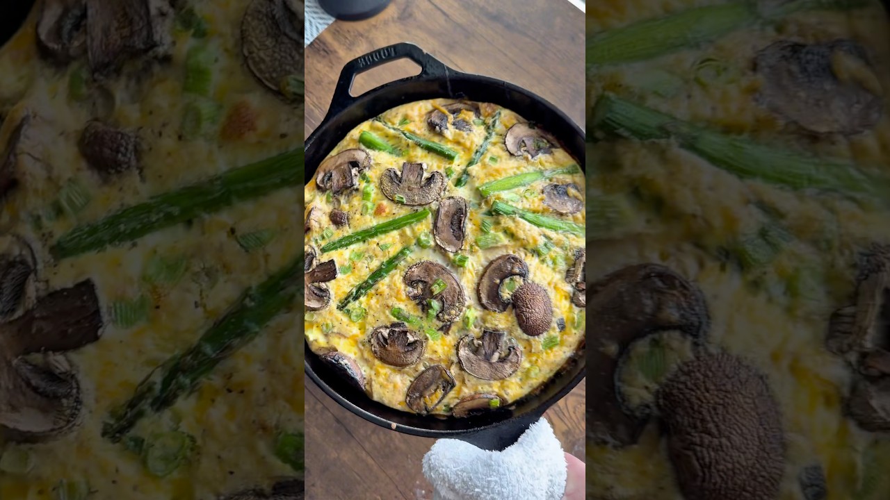 Once upon a time, a guy wanted a breakfast that was pretty enough to serve to people, but easy and healthy enough to eat throughout the week for himself. So, he maxed out his credit card, buying enough eggs to use 12 in this frittata. He used milk, some garlic, salt, and pepper, and whisked it all together to make a nice little mixture there. Sauteed up some asparagus, and mushrooms, poured the egg mixture into a cast iron skillet, and then baked it. And thus, the frittata was born. Sliced into eight gorgeous slices.