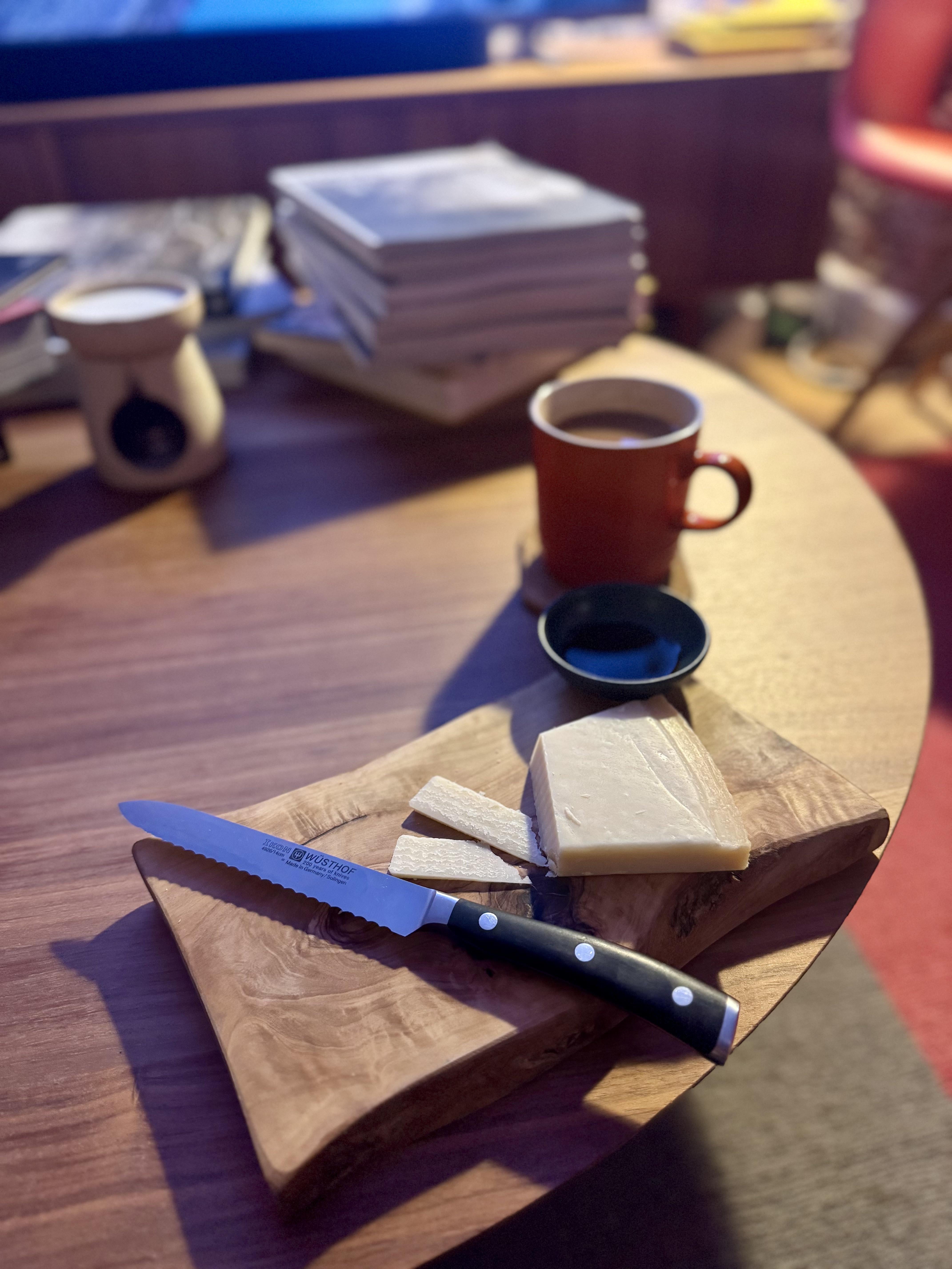 I deliberately don’t keep snack foods in the house, so when I do get peckish it’s either full meals or a block of unsuspecting cheese. Parmesan and balsamic glaze; Yorkshire tea.Strapping myself in for a wild night of cheese dreams.by csswizardry Dining and Cooking