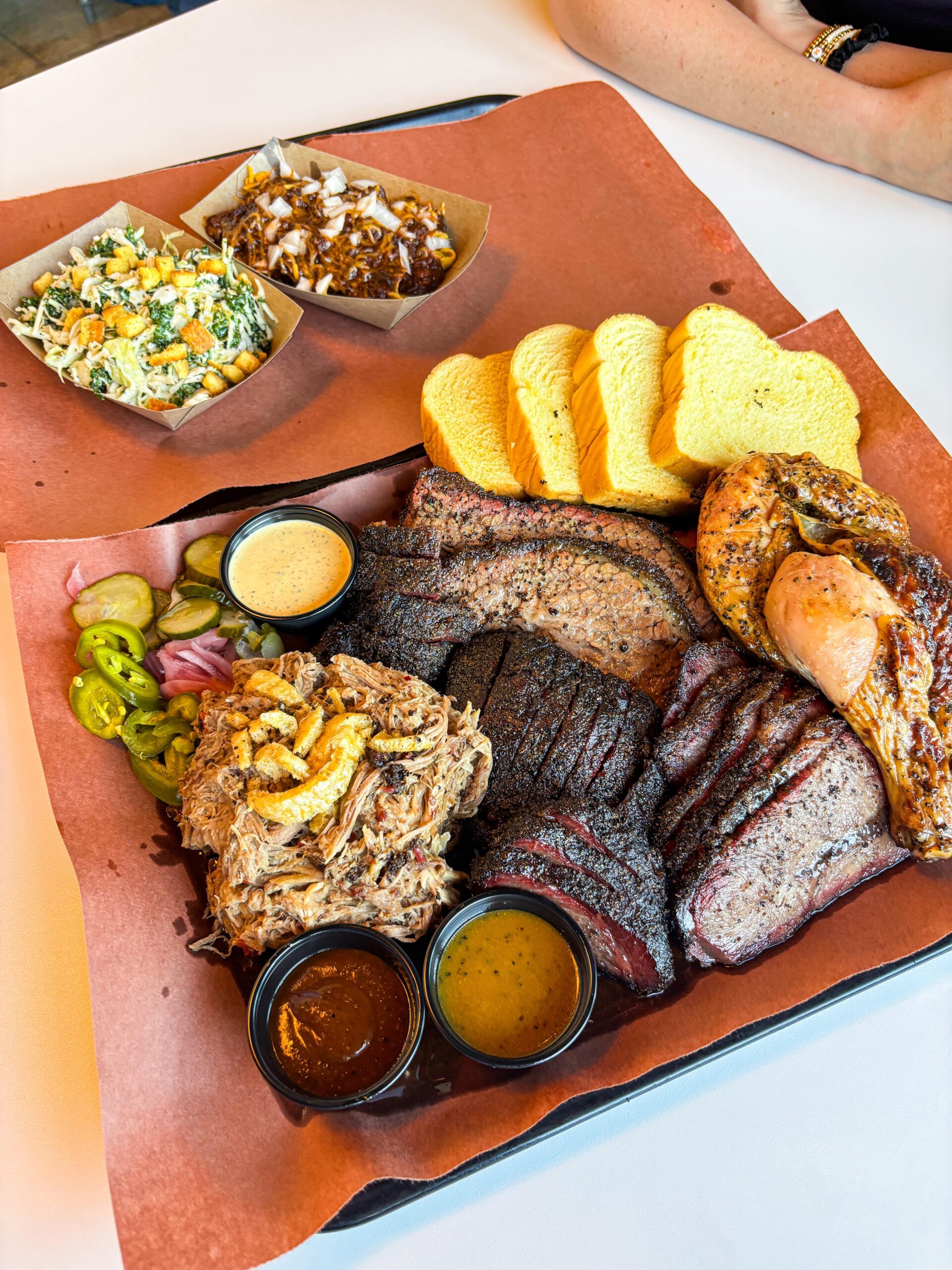 Brisket, beef cheek, flat iron, whole hog, half chicken, kale Caesar salad & Frito pie