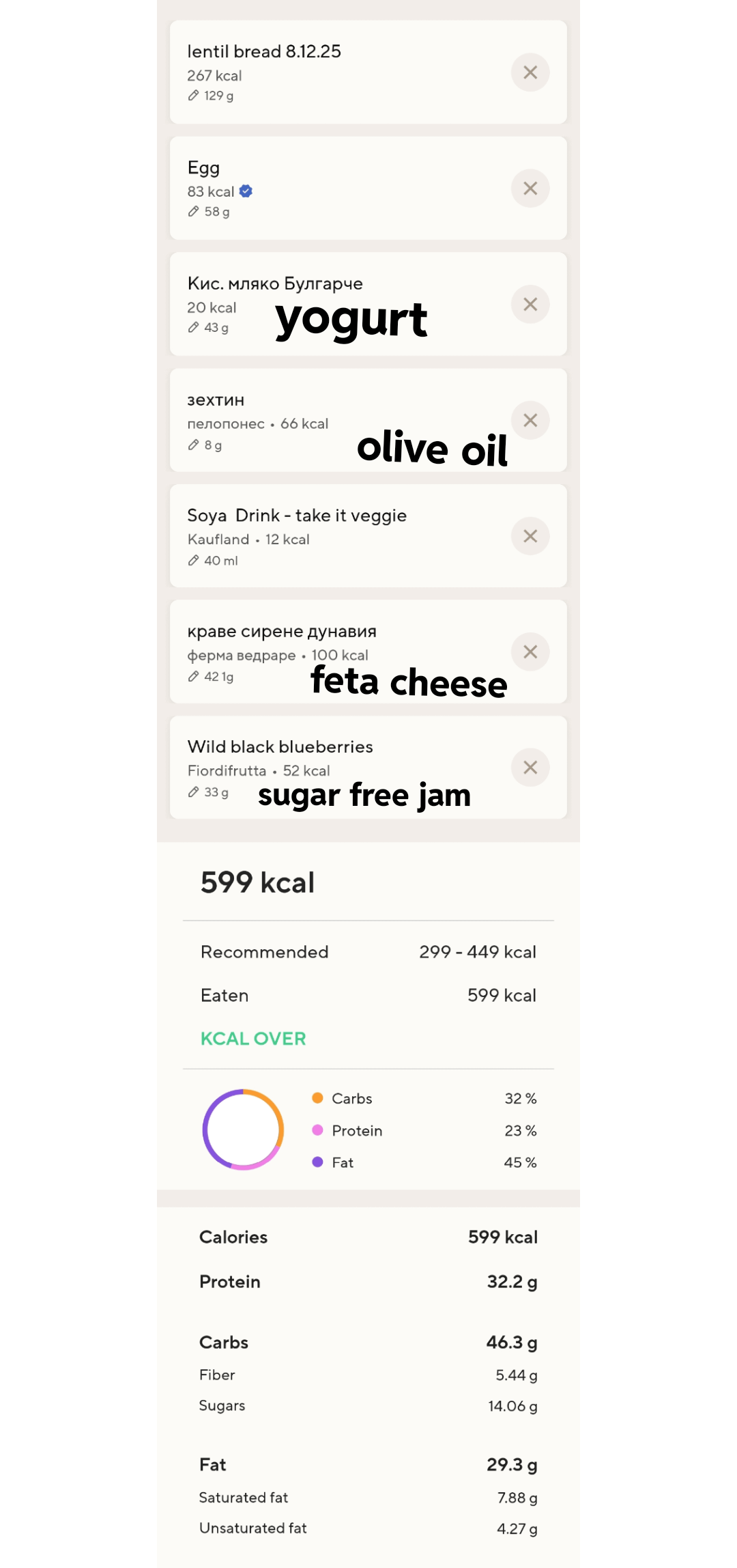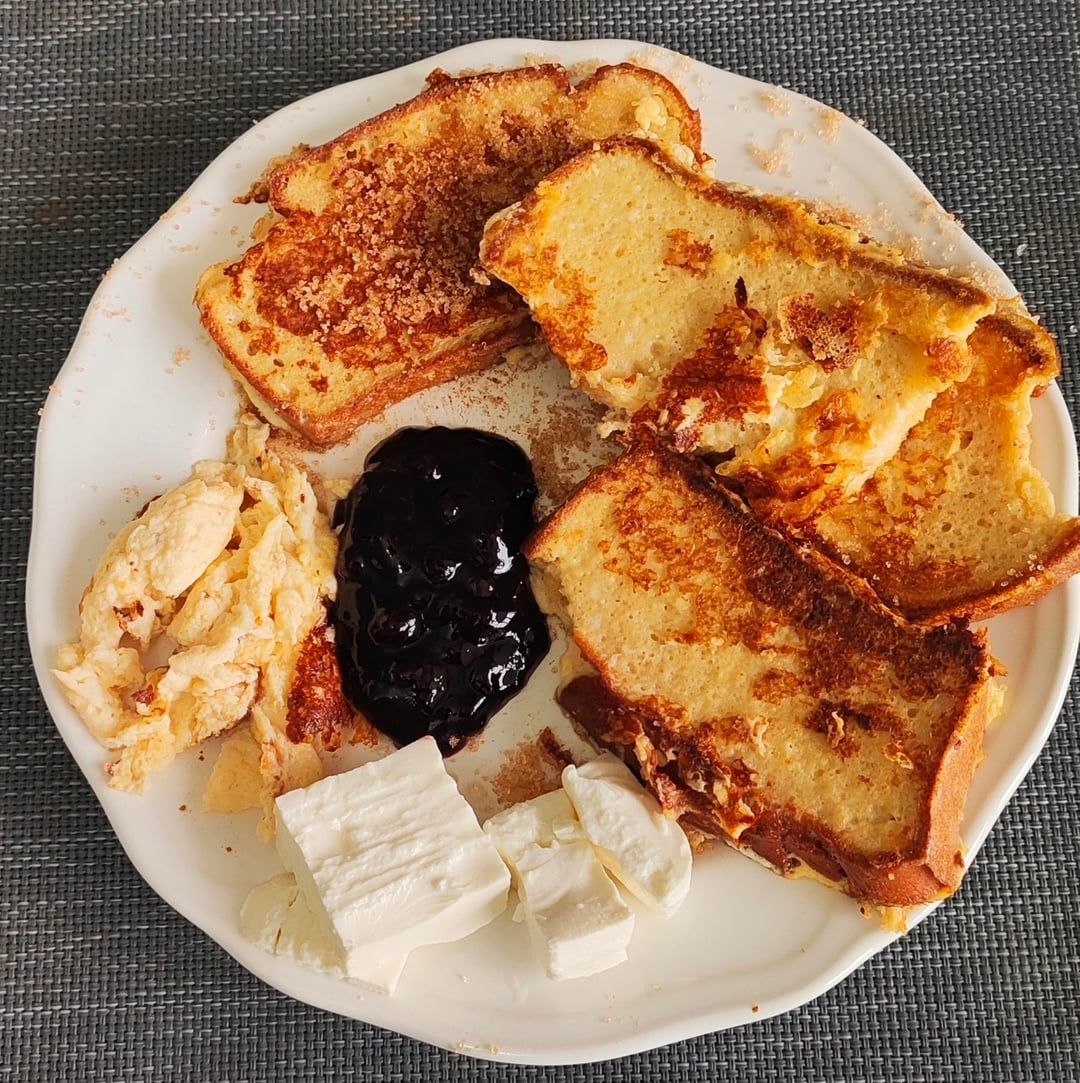 Breakfast: French toast with cinnamon & erythritol, feta cheese & blueberry jam (this is a classic combination in my country, don't knock it til you try it)
