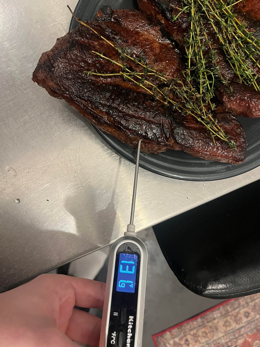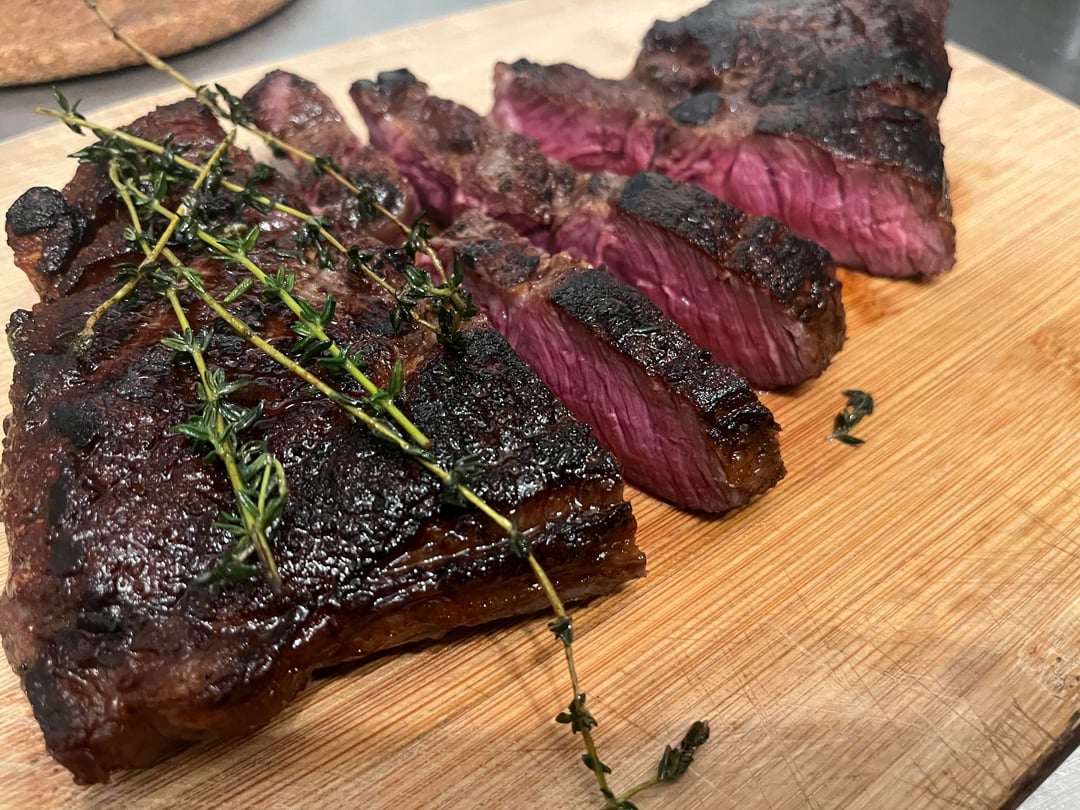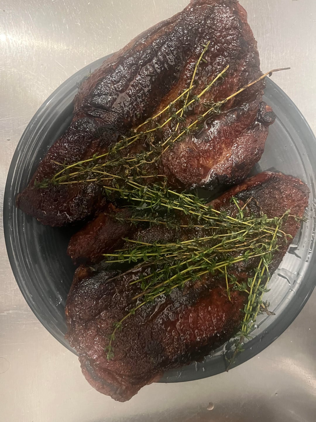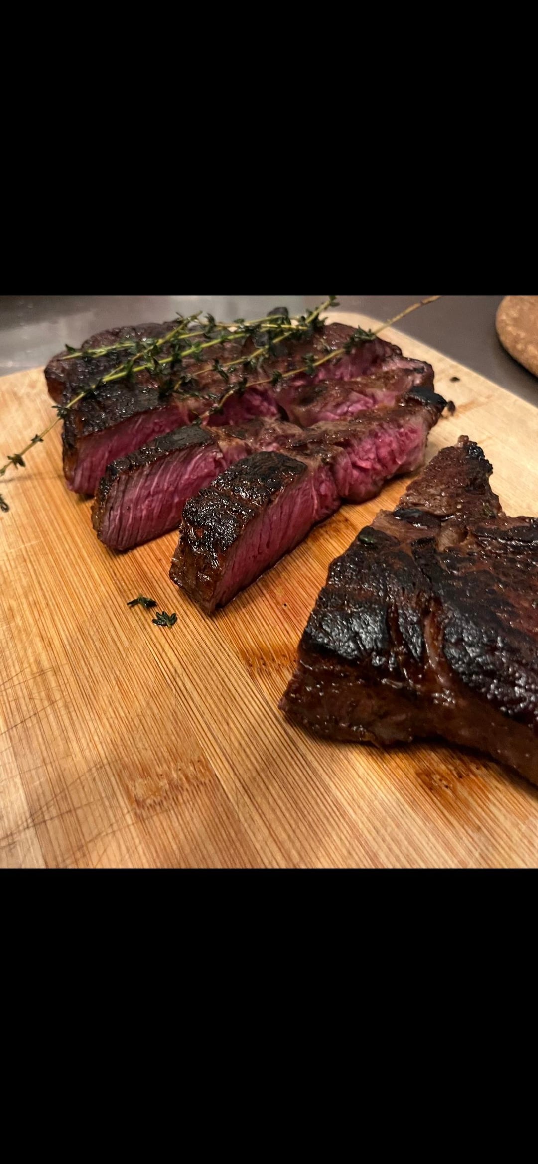To cook two sirloins with the goal of medium rare, I used the below process which I’ve learned, generally, from this subreddit. Super happy with how these turned out. I salted 3 hr in advance. I used a wire rack and put these in the oven at 250 F, until the steaks rose to around 110 F internal. I let them sit for 5-10 min at room temperature, patted dry, got a pan ripping hot. I pan seared for 2 min each side with grape seed oil (high smoke point), rotating every 30 seconds to get a nice sear with tongs. At the end of the second minute, I flipped, reduced the heat slightly (so the added butter wouldn’t burn too much), and added butter/fresh thyme. Before the second flip, I rendered the fat while the heat reduced. Anything you would have done differently?