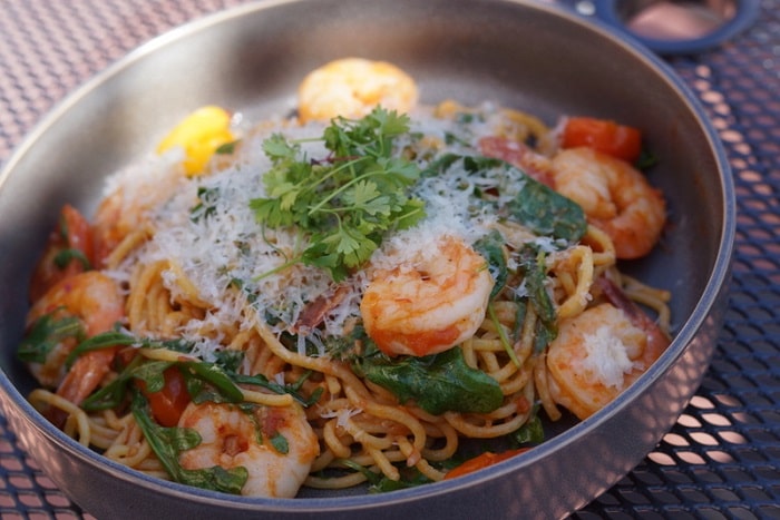It’s a very fresh tasting, generous portion of tender shrimp atop perfectly cooked al dente spaghetti with a light “sauce” of fresh tomatoes and garlic, arugula, lemon zest, pepperoncini to give it some zing, and shredded parmesan.