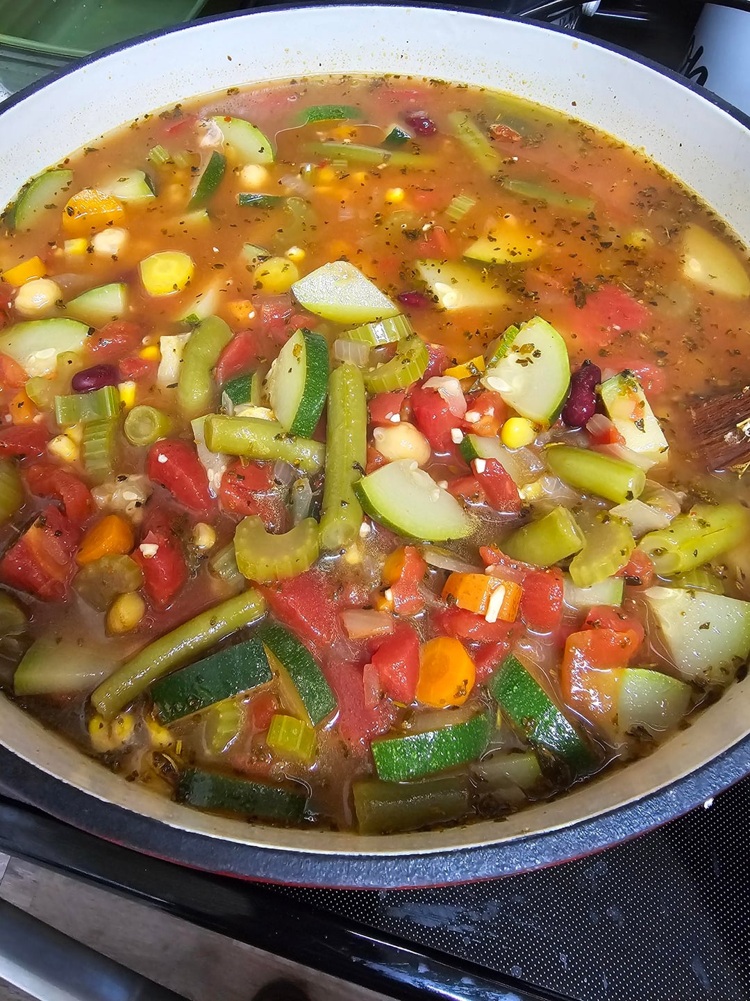 Canned items: chickpeas, red kidney beans, green beans, sweet corn. Diced tomatoes with Italian seasonings, diced tomatoes (low sodium)