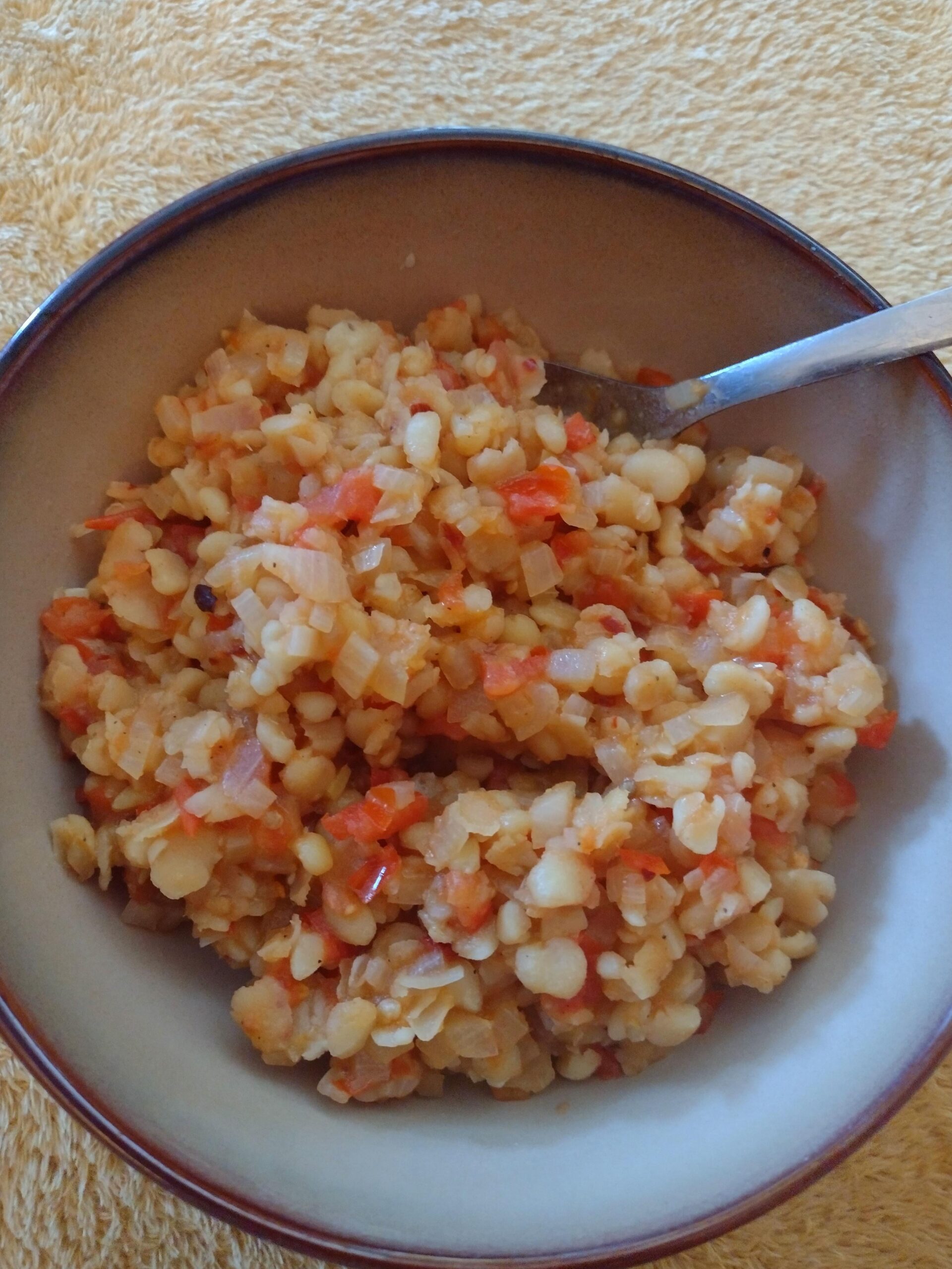 Recipe – sauté a couple of finely diced onions in a tablespoon of whatever oil you like until translucent. Add three finely diced tomatoes and season. I used salt, white pepper and chilli flakes. Cook for a minute and add 1.5-2 cups of cooked pulses of some description – mashed if you like (if I use bigger pulses like chickpeas I have at them with a fork to smush them up a bit). I used split fava beans. Add a quarter cup of water or the cooking liquid from the pulses, if you remembered to save it, which I did not, whoops. Cook, stirring often, until the tomatoes are nicely cooked through. Makes two big portions or would feed three or four if served on toast or as part of a cooked breakfast.