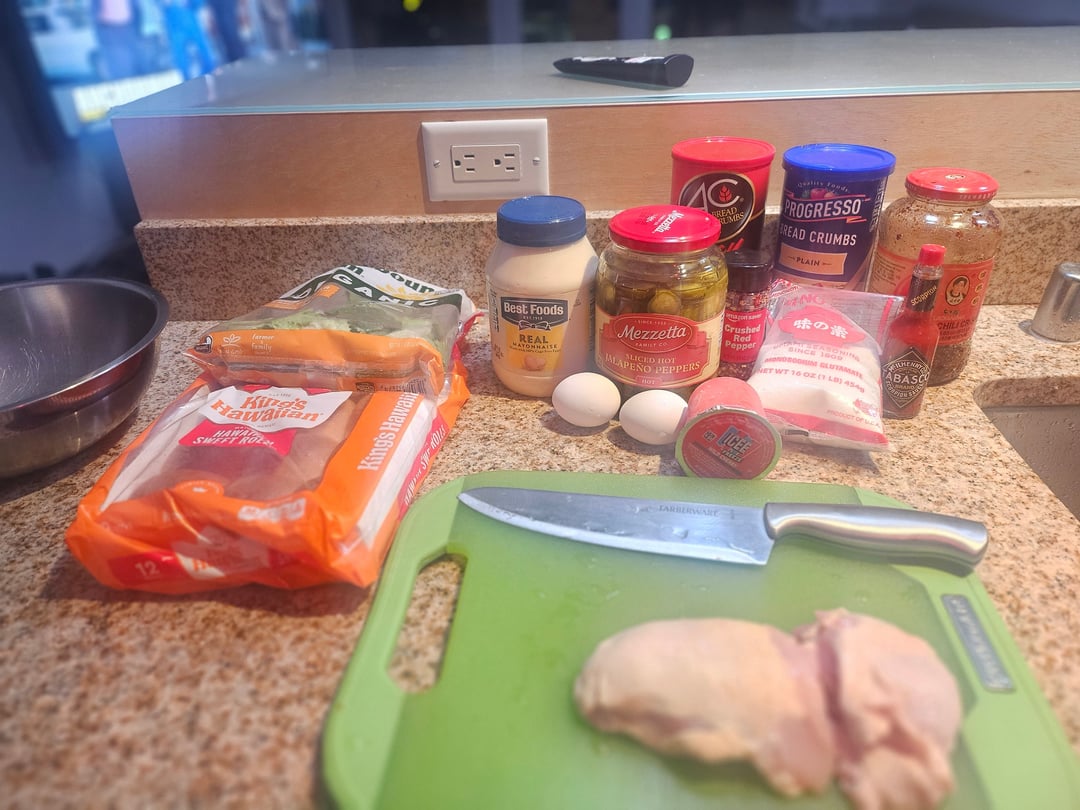 (Boneless chicken – covered in flour – then dipped into raw egg – finally covered in panko/bread crumbs – then deep fried Not air fried. I mix in pepper/hot sauce in the raw egg and make up my own hot sauce. Some sliced pickles and throw er on a bun