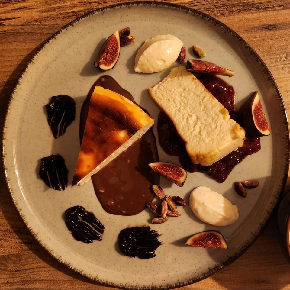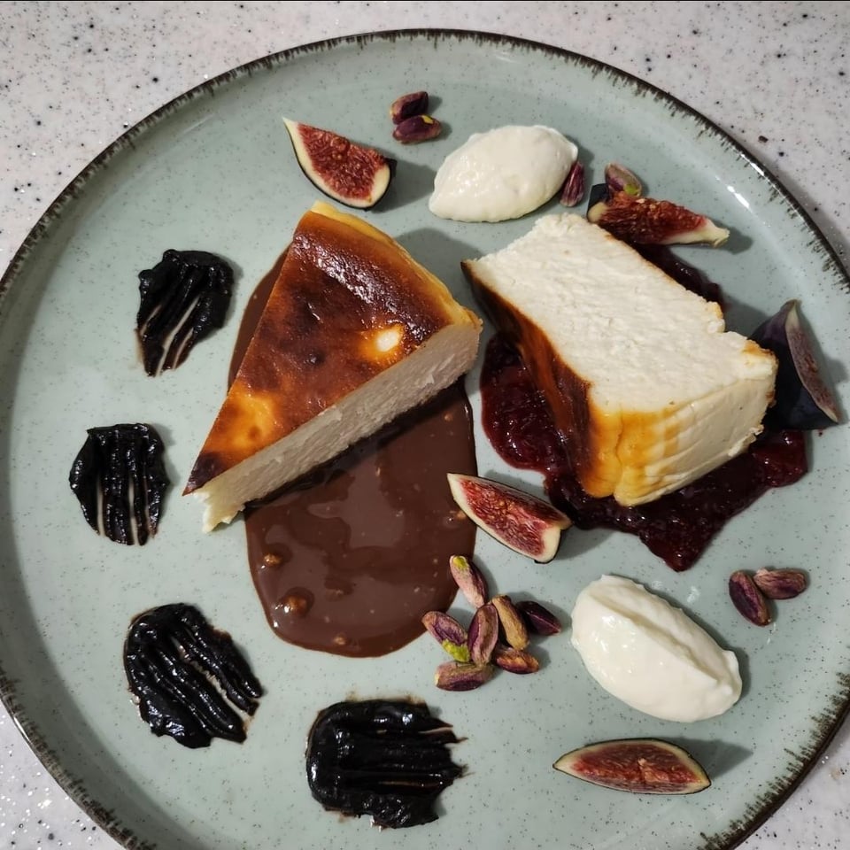 Theres just too much going on here. Basque Cheesecake should be good enough to stand on its own if youve made it correctly. It doesnt need a Applebee’s dessert sampler vibe thrown at it.
