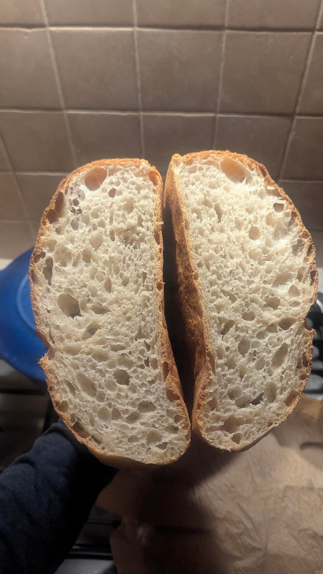 When I turned it out of the banneton and scored it basically turned into a pancake, like soo flat I was like oh god this will be awful. Anyway baked with lid on for 25 mins at 250°C then lid off for 20 mins at a slightly lower temp. And was so surprised it actually rose a decent amount. When I cut into it I was so pleased to still see a great structure inside.