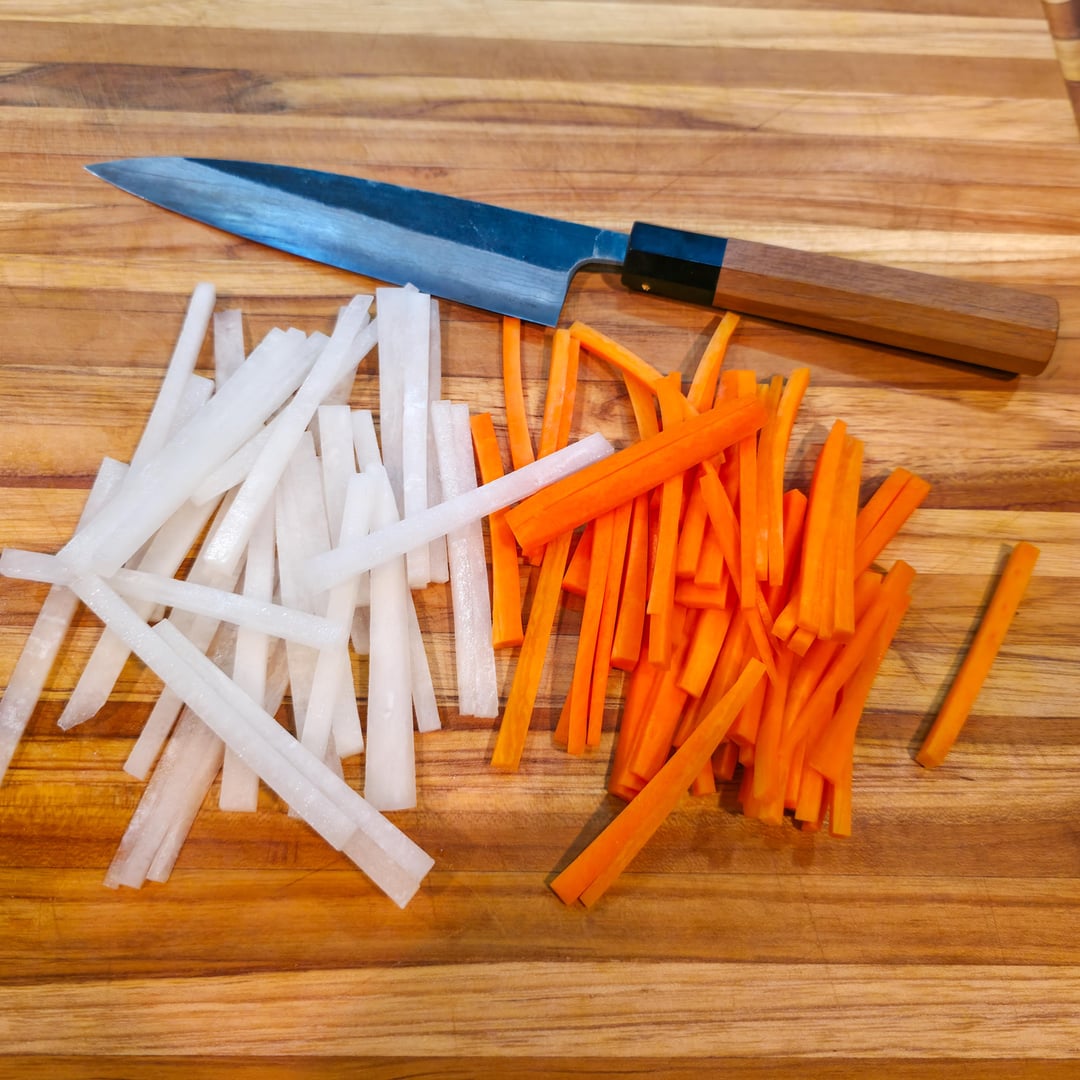 – Julienne carrot and daikon and place in bowl. – Use just enough rice wine vinegar to coat vegetables. *Should not be “swimming” in it. – Add salt/sugar to taste. – Let sit in fridge for at least 30 mins before making sandwich.