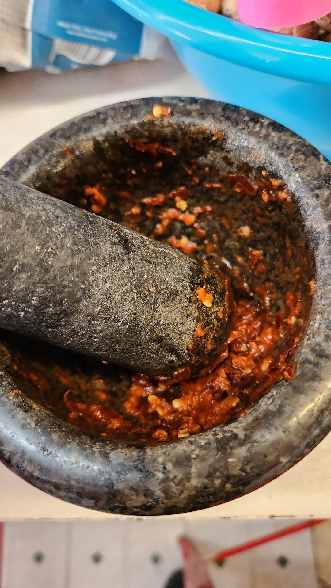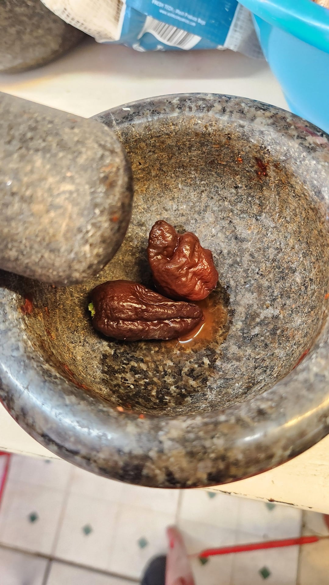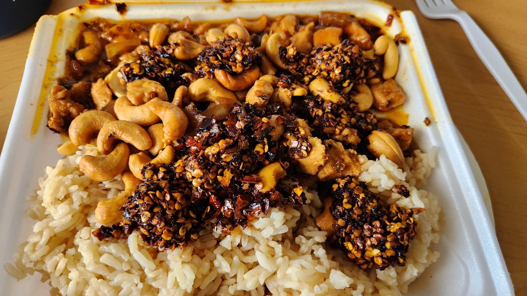 Cashew chicken with 2 chocolate Devil's Tongues mixed in. These peppers were frozen as they're out of season, but during the summer, the owner has the fresh pepper plants outside and lets you pick them and grind them up yourself. She mixes chili pepper oil into the chicken and has extra to top it with, as I did here. Some of the best food I have on a regular basis.