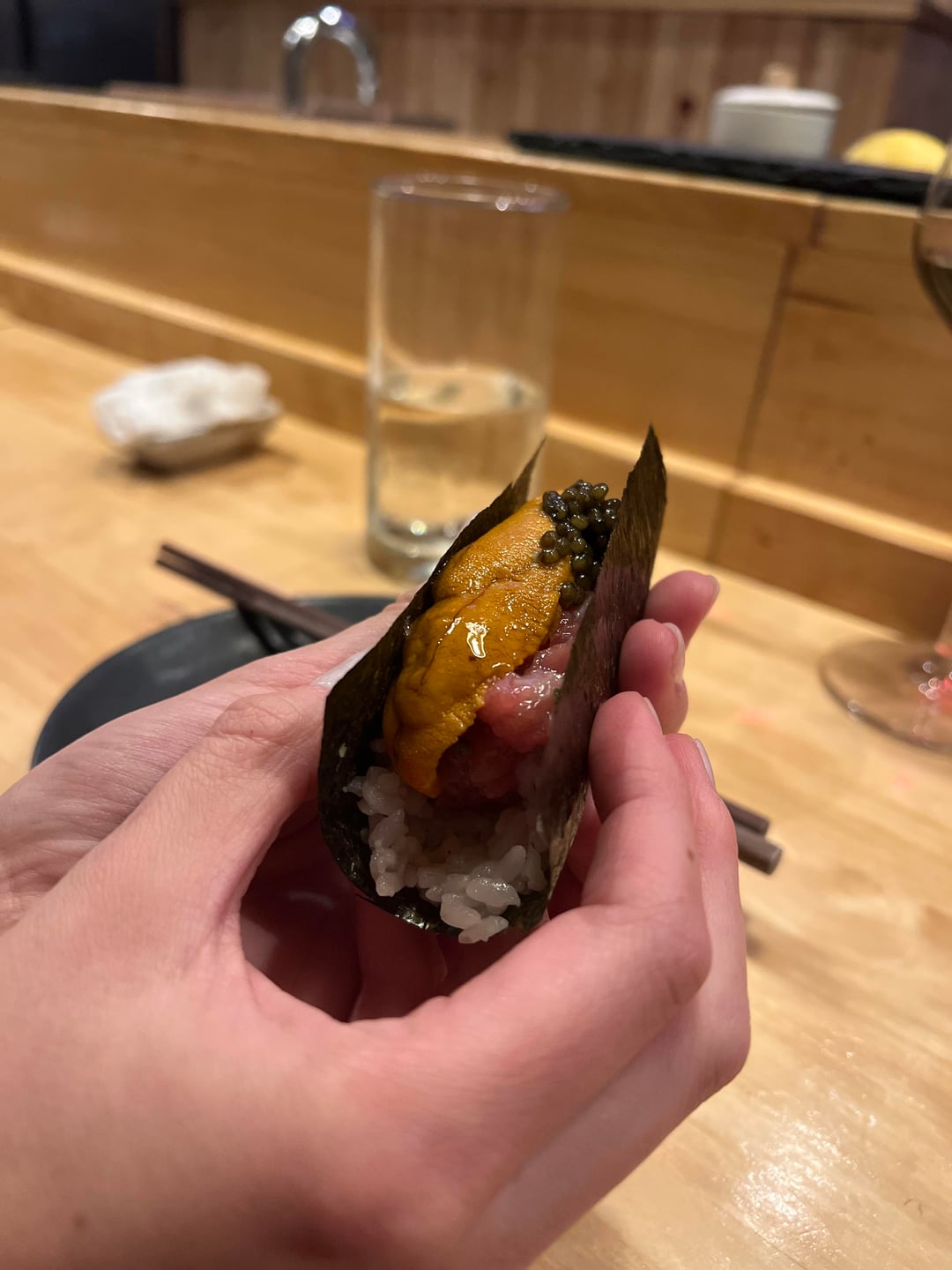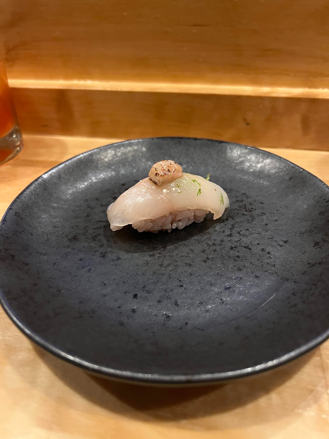 Scallop, fluke, squid, yellowtail, salmon, eel, sweet shrimp, toro/unagi, wagyu, and a delicious paper plane to her wine!