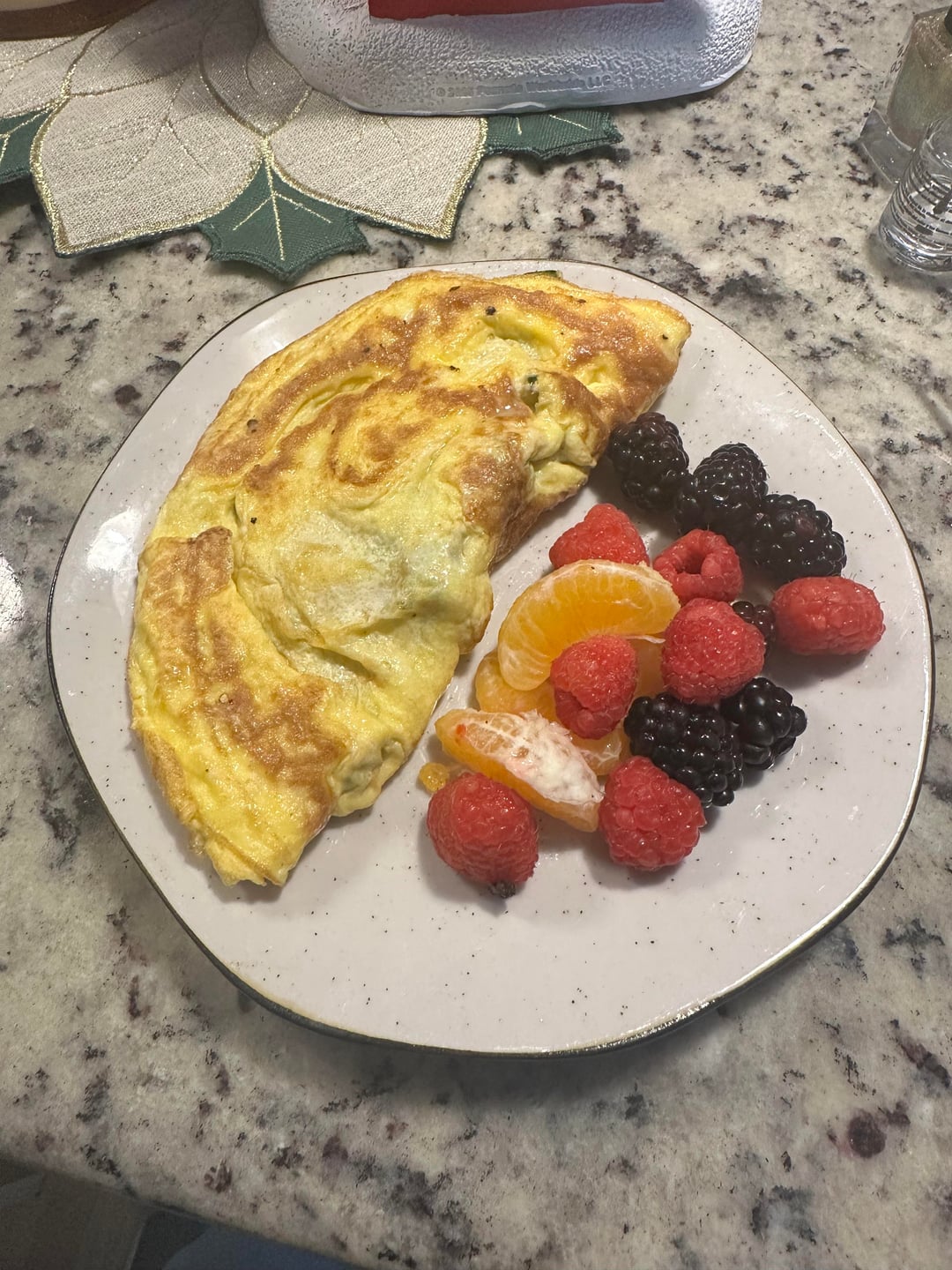 Overcooked omelette with mushroom, zucchini, and cheddar. Side of fruit. 403cal