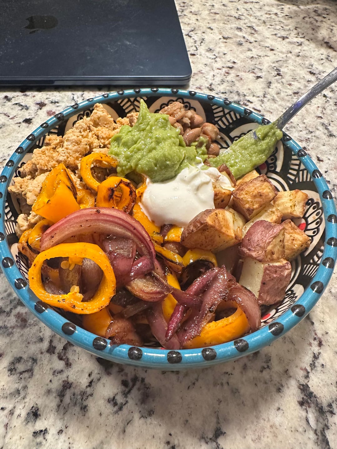 Ground chicken, baked potato cubes, sautéed onions and peppers, pinto beans, Greek yogurt and mashed avocado. 541cal