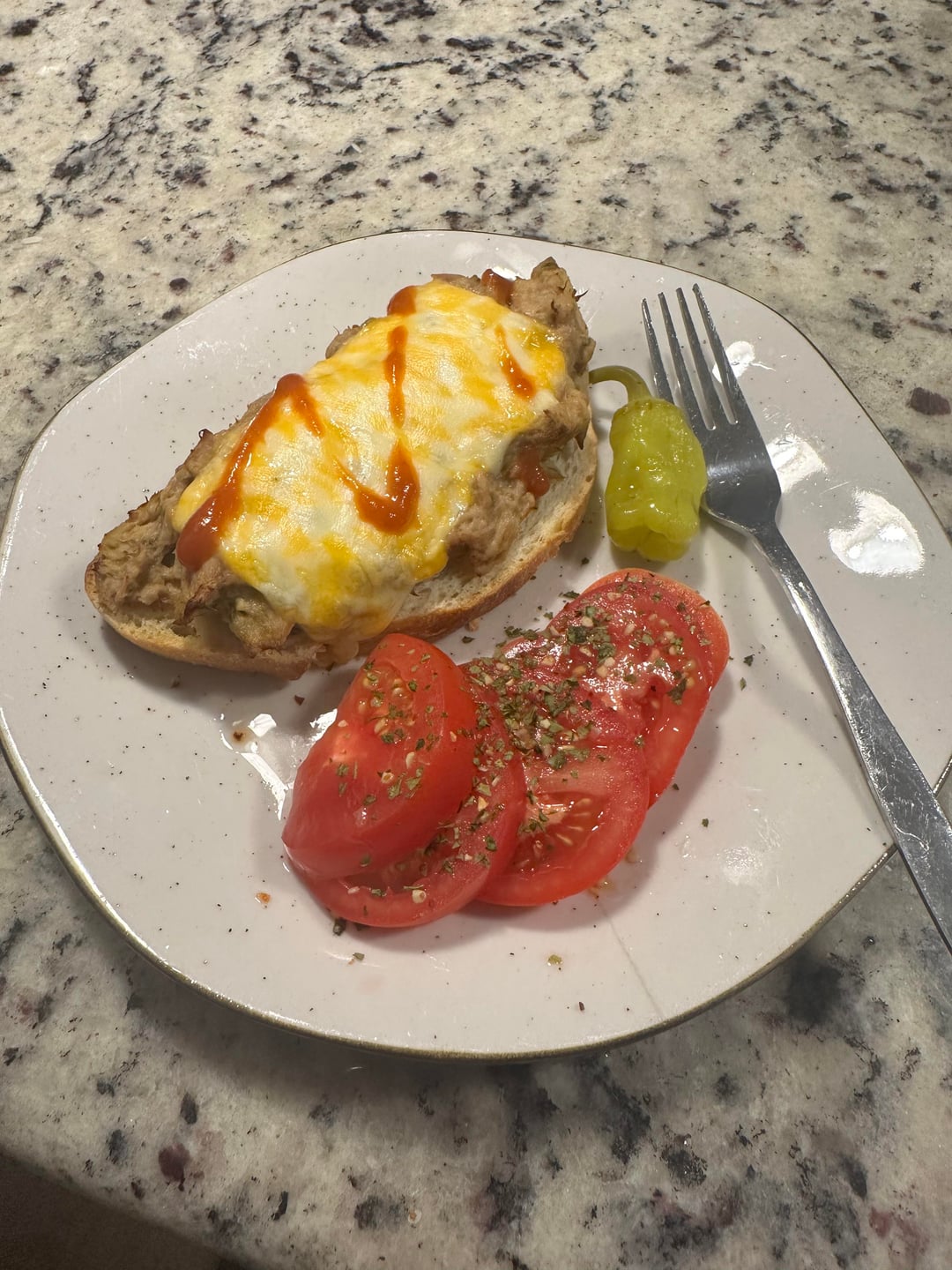 Tuna melt on sourdough with half slice of Colby cheese and hot sauce. Made with pickle juice and kewpie. Side of tomato and a peppercini. 239cal