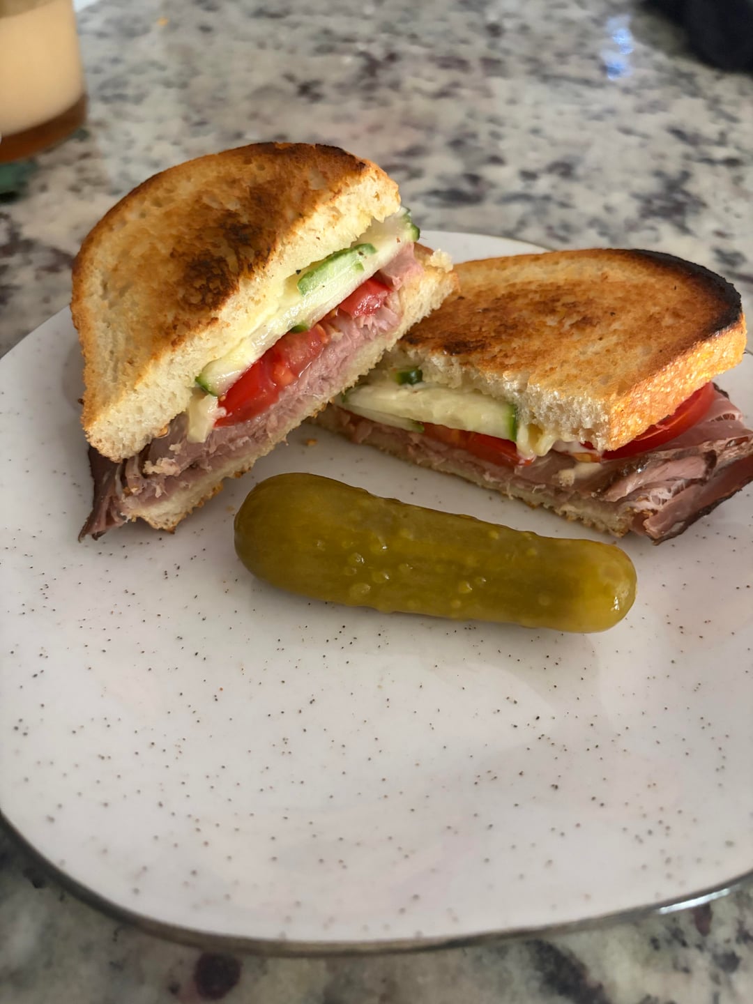 Sourdough London broil sandwich with cheddar, cucumber, tomato, and kewpie. Bubbies pickle on side. 466cal.