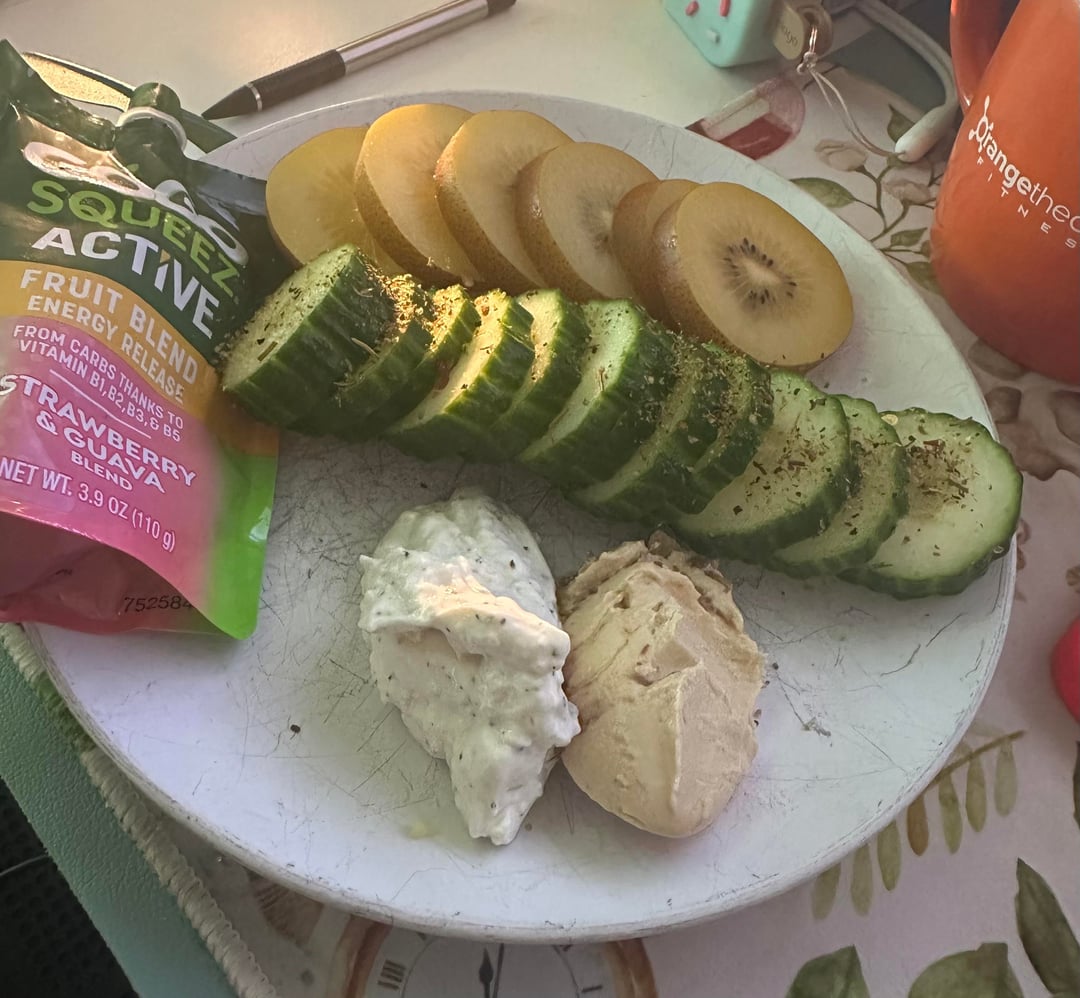 Cucumber, olive tapenade hummus, tzatziki, a kiwi, and a gogo squeeze. 244cal