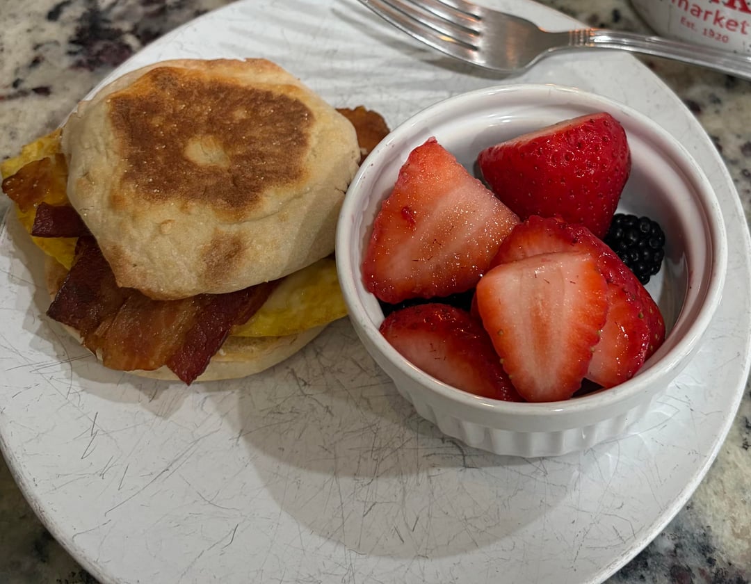 Sourdough English muffin, 1 bacon slice, egg, cheddar. Side of blackberries and strawberries. 356cal