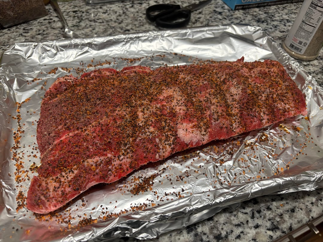 To prep I used Worcestershire sauce as a binder, used Meat Church Blanco as my base, then topped it off with Meat Church Holy Cow rub. Then left in refrigerator overnight.