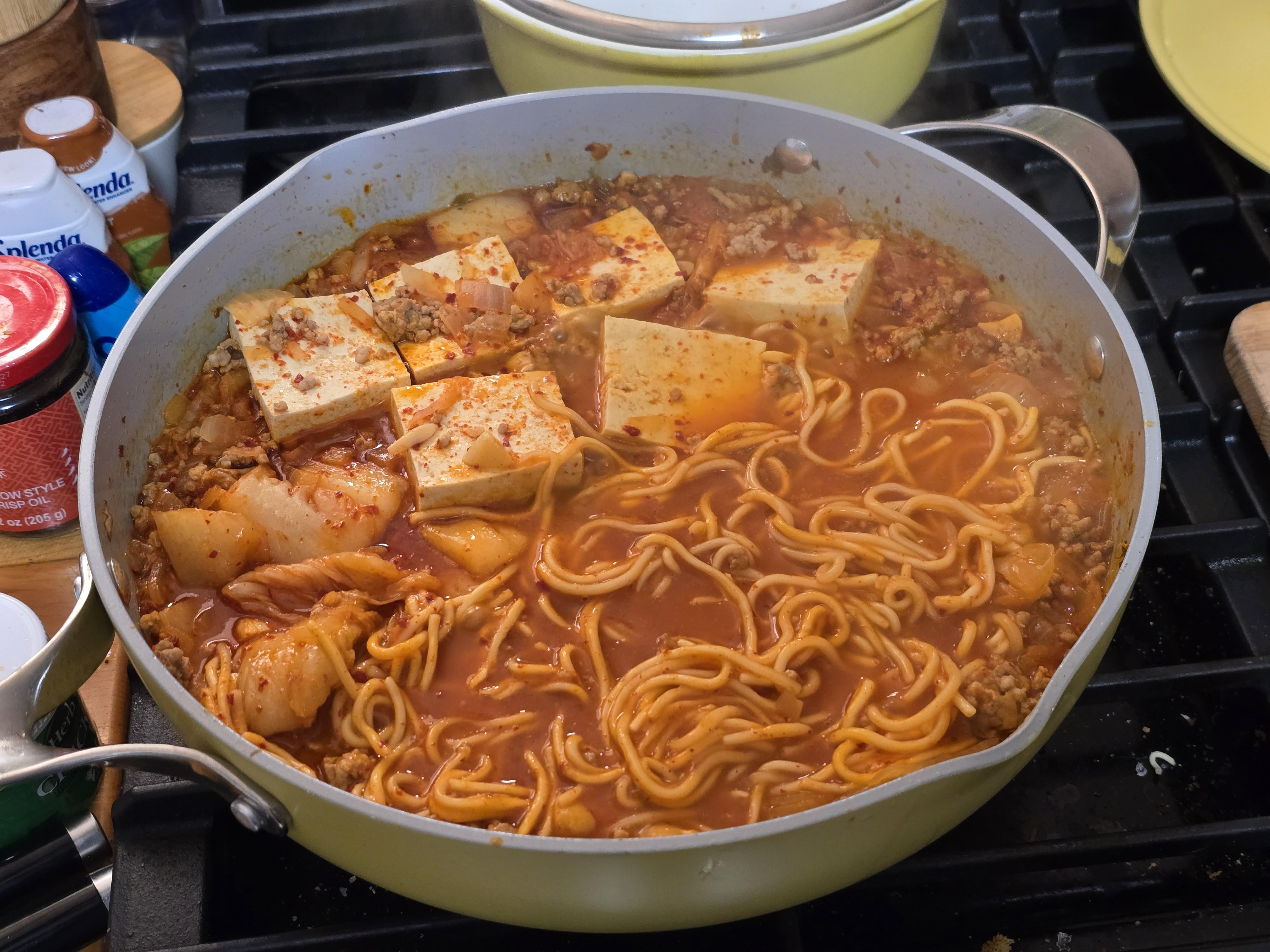 Idk if this is "kosher" or not but I made a jjigae with ground pork and noodles instead of rice on the side. Didn't feel like waiting an hour on the rice cooker after the day I had at work..