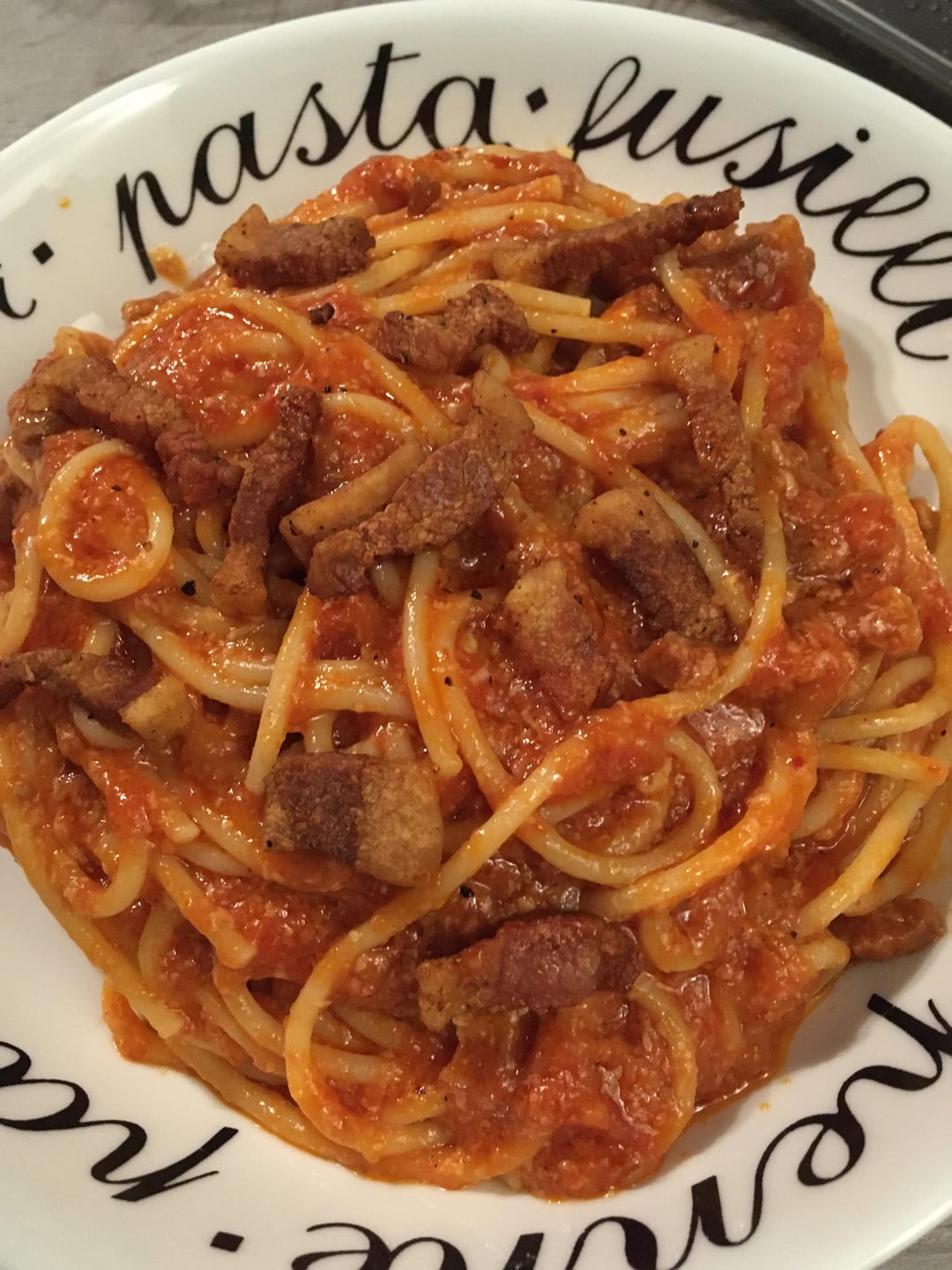 Felt like making the spiciest, most savory Amatriciana as of yet. Plenty chili flakes, black pepper, a big slab of guanciale and an unholy amount of Pecorino Romano.
