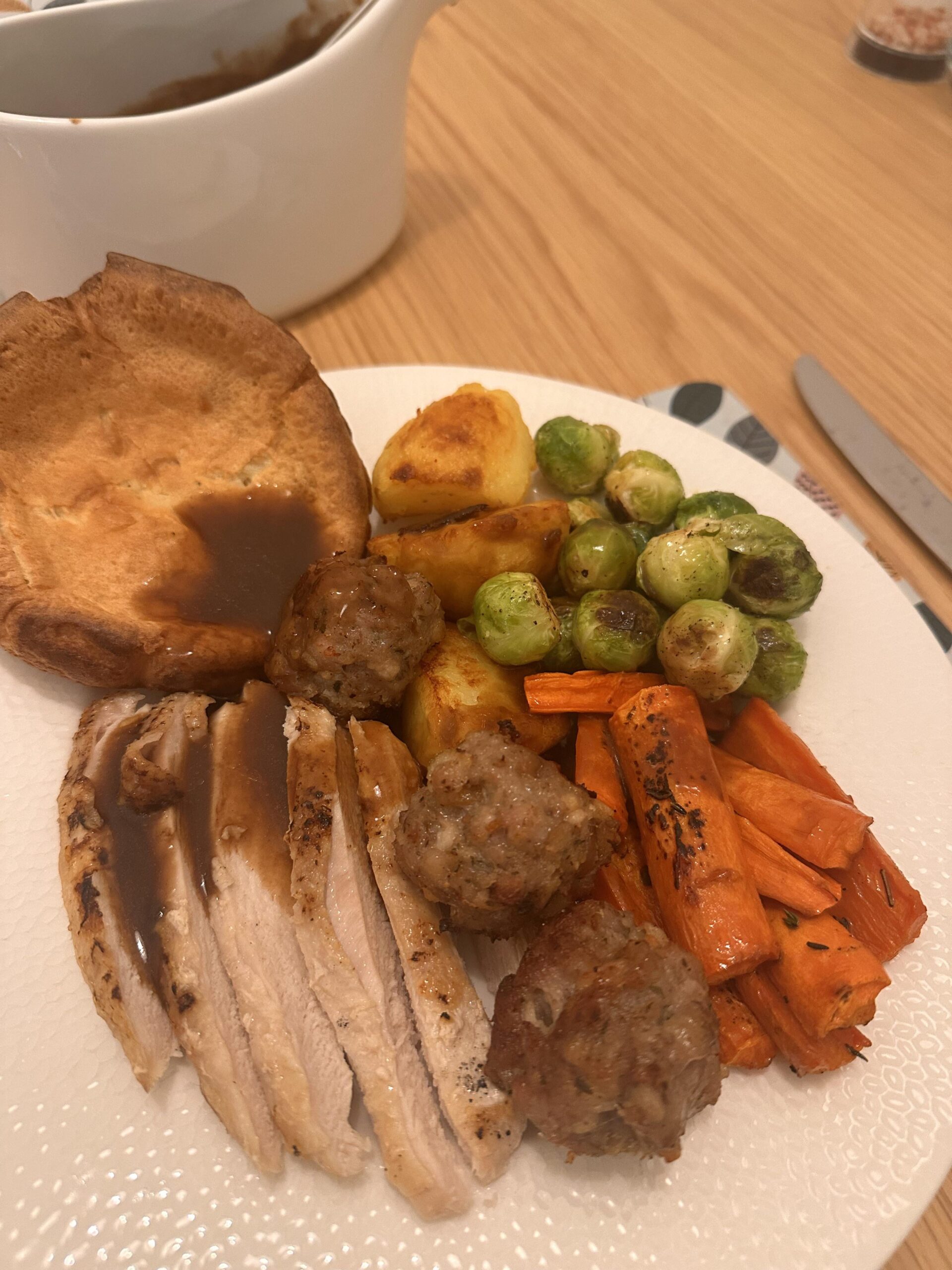 I had the urge, so did a roast chicken breast, maple glazed carrots, pan fried sprouts, roast potatoes and pork / chestnut stuffing.