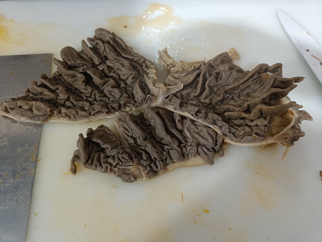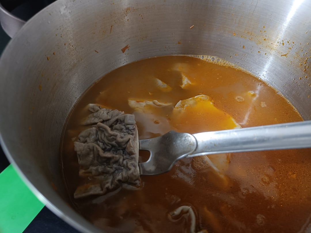 If you think (before cooking it yourself) that it still has strange odors or something else, boil it in water and vinegar until it loses all the odors, then boil it for another 10 minutes without vinegar before starting the rest of the procedure by boiling it in the broth.