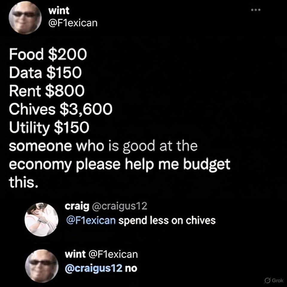 Why are there two different line items for food? Just eat the chives… Problem solved!