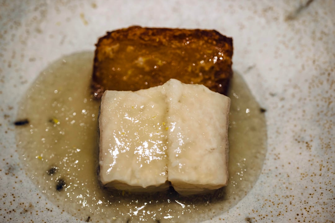 Cashew tofu topped with bean paste and cashew zest – tofu made with kudzu inspired by recent trip to Brazil. Tofu chewy texture was delightful, the cashew buttery and sweet flavour was an excellent match to the paste.
