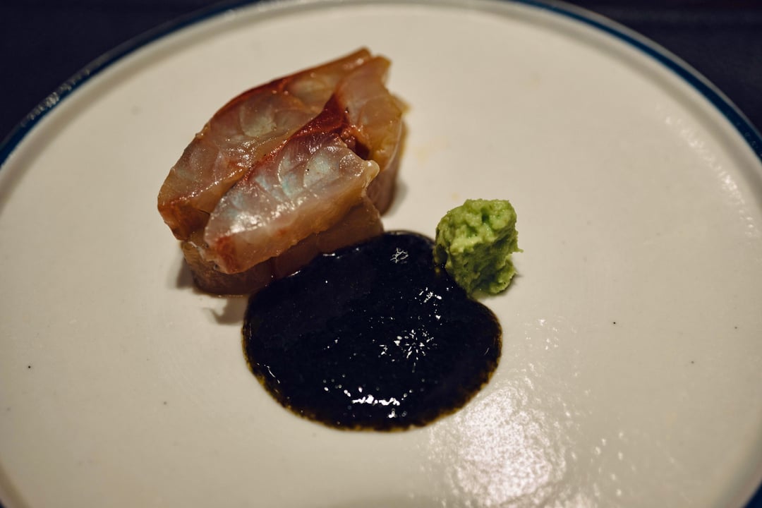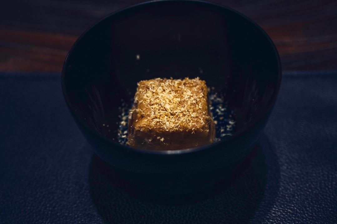 Miso marinated fois gras monaka with black figs and smoked daikon radish – fois gras still has nice texture, the figs and daikon surprisingly very pleasant combination. Strong umami with a bit of sweetness, pretty enjoyabel start.
