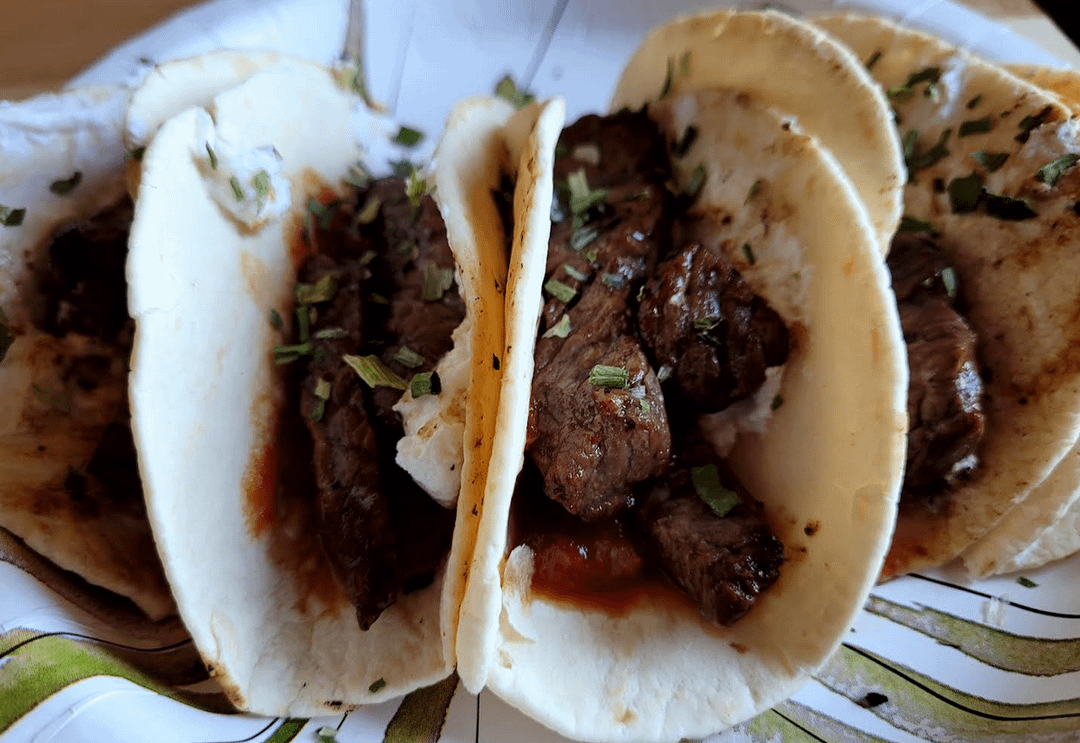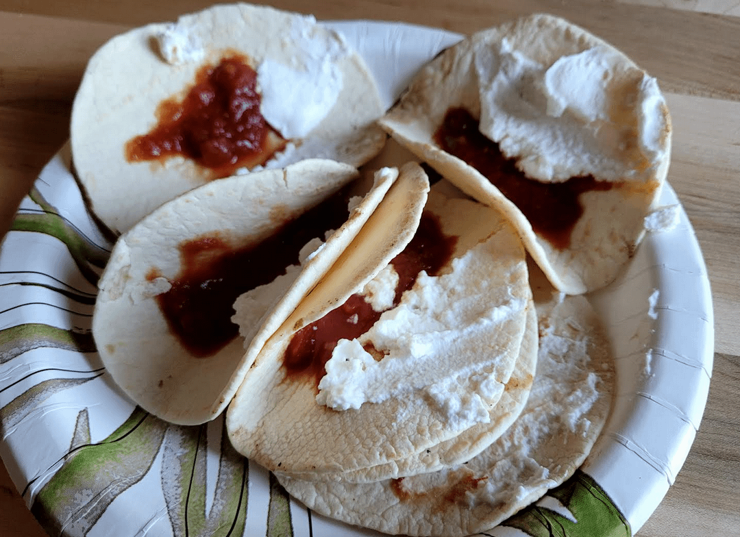 Use 1 tablespoon Fage 0% Milkfat Plain Greek Yogurt for all 5 tortillas and dress them before the steak (easier to spread).