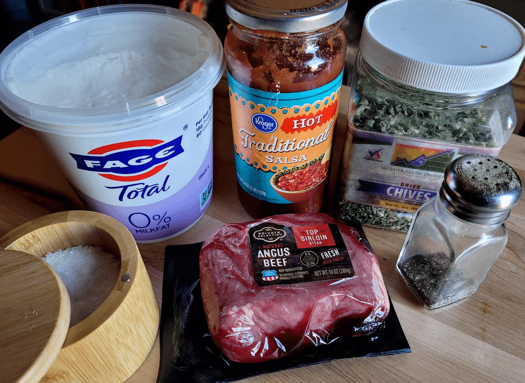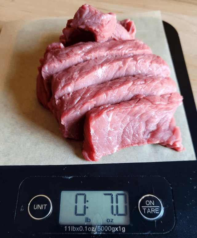 Cut, weigh 6oz lean sirloin. (The scale says 7, but I ended up leaving an ounce off.)
