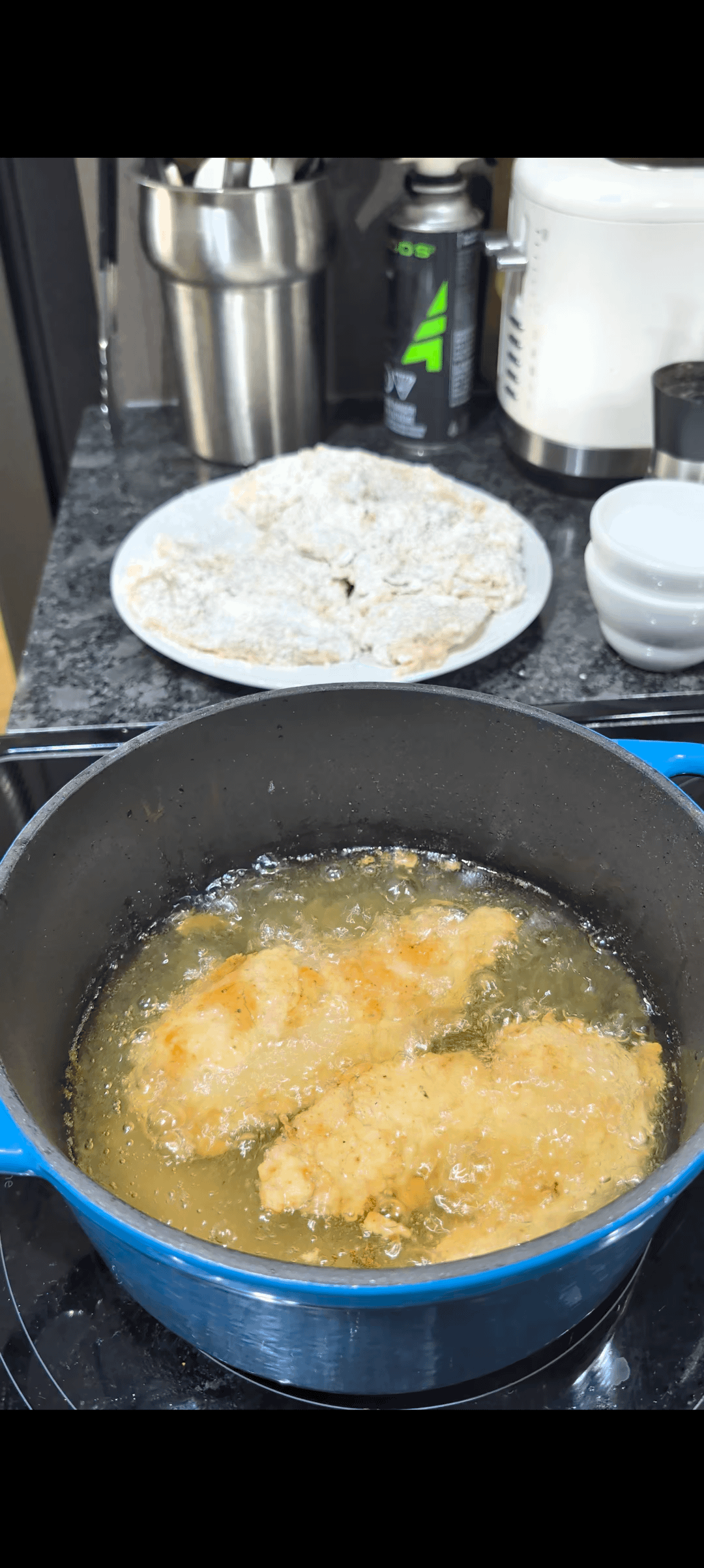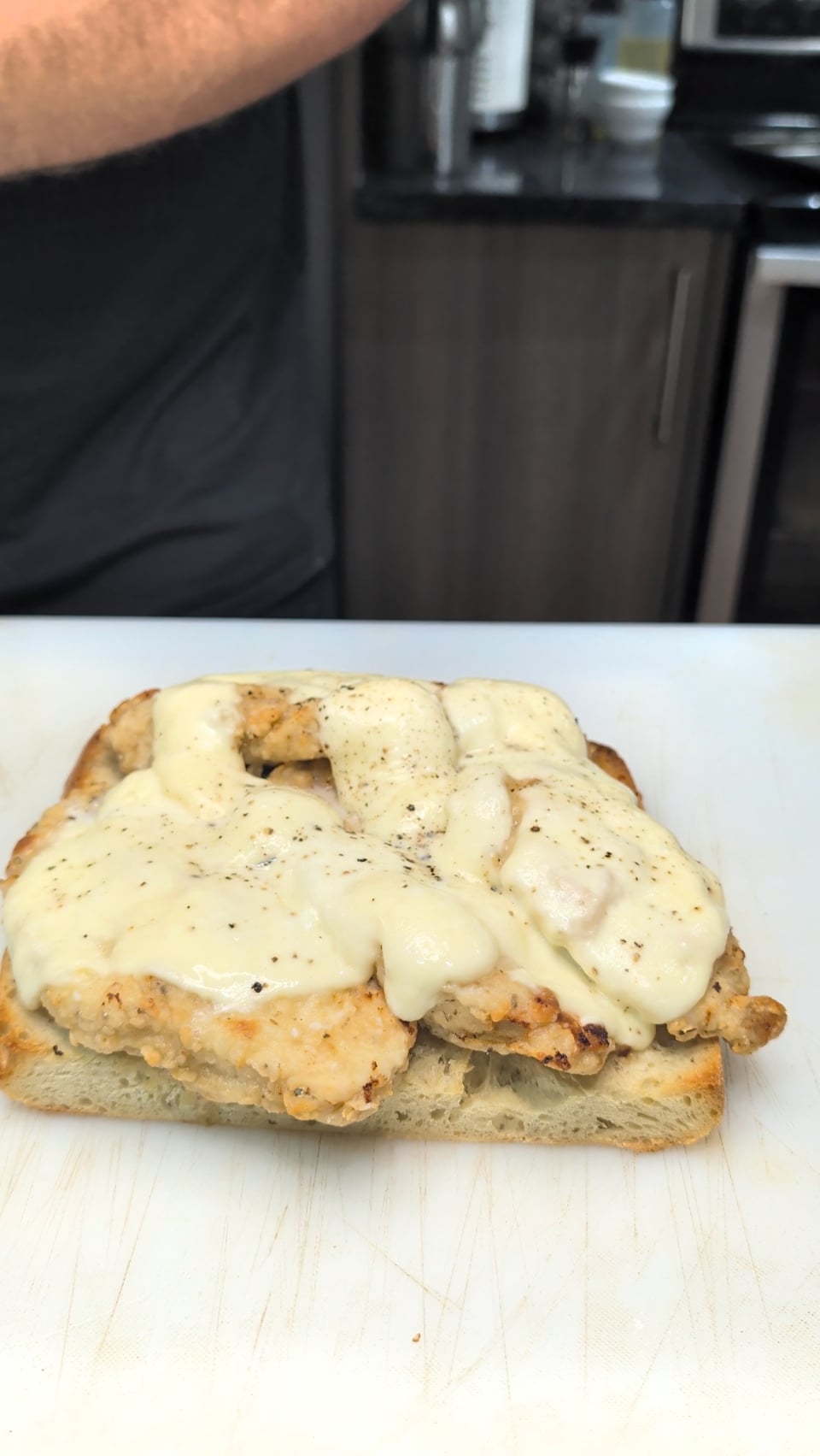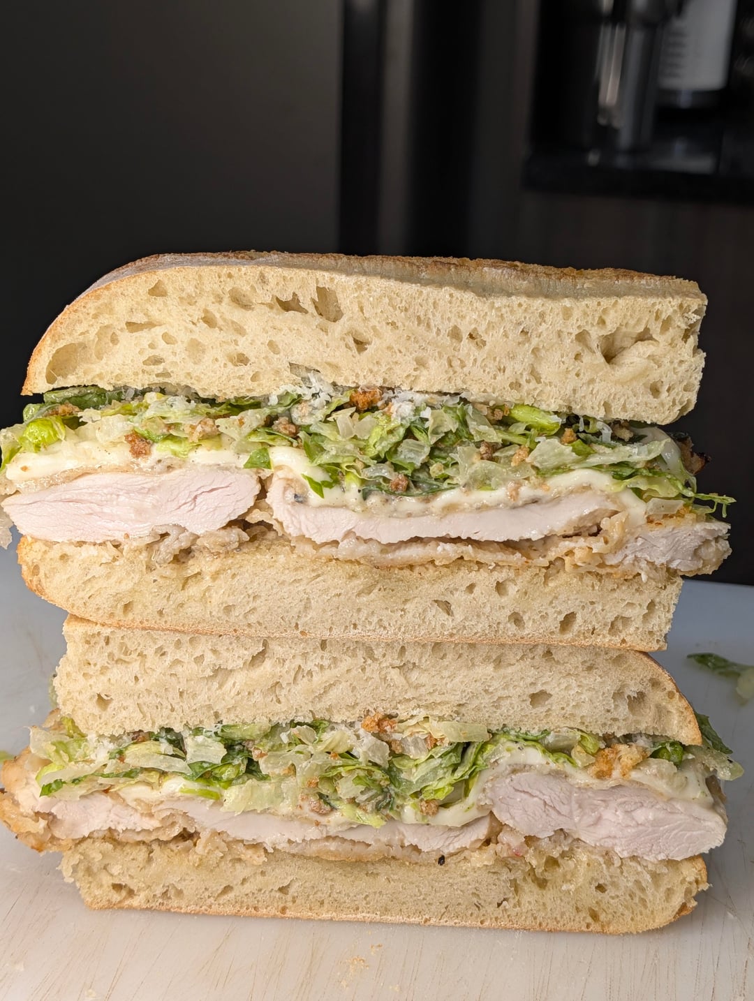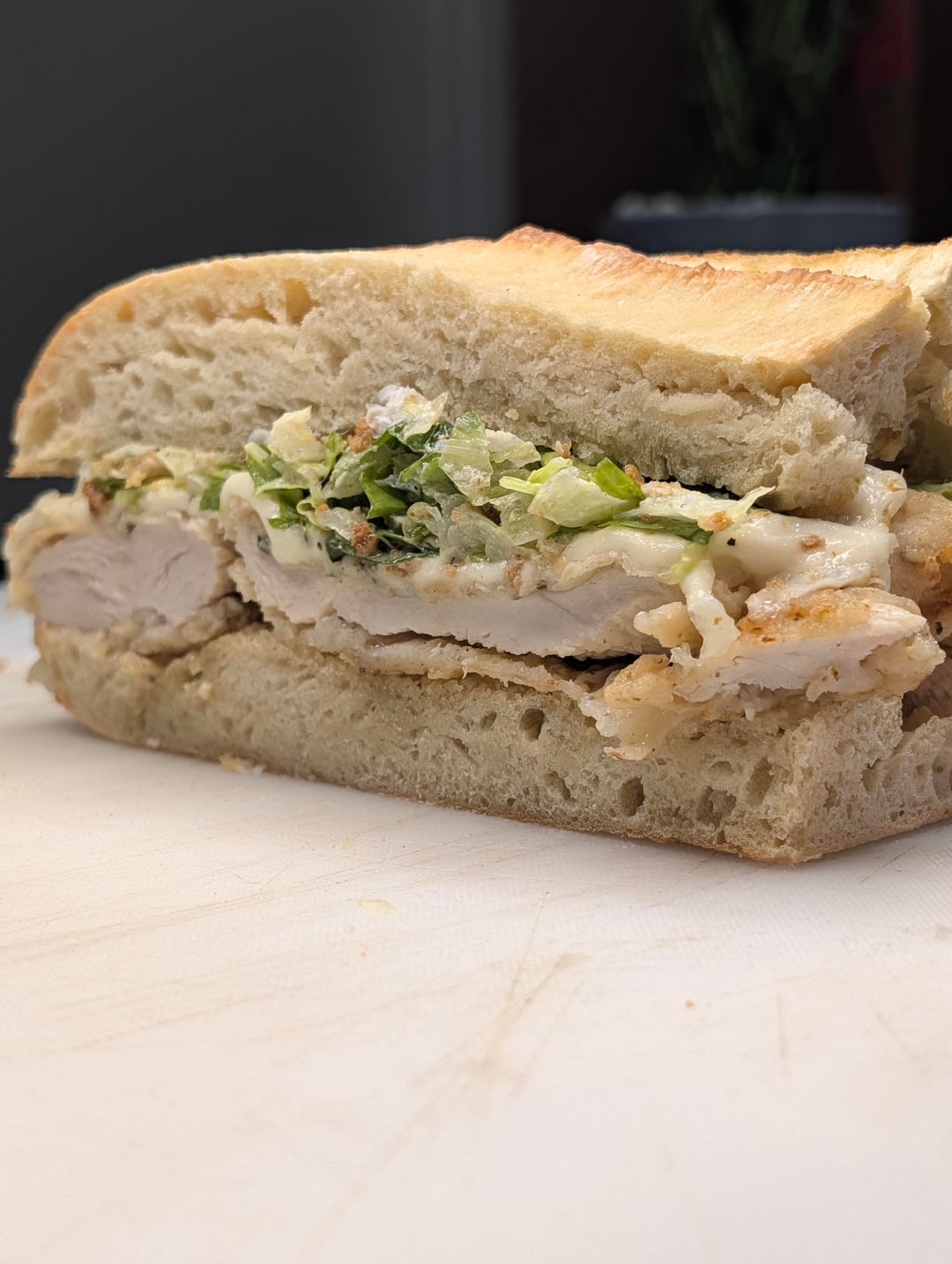 Buttermilk brined chicken breast, breaded and fried, fresh mozza, pile of caesar salad w/ caper caesar dressing.