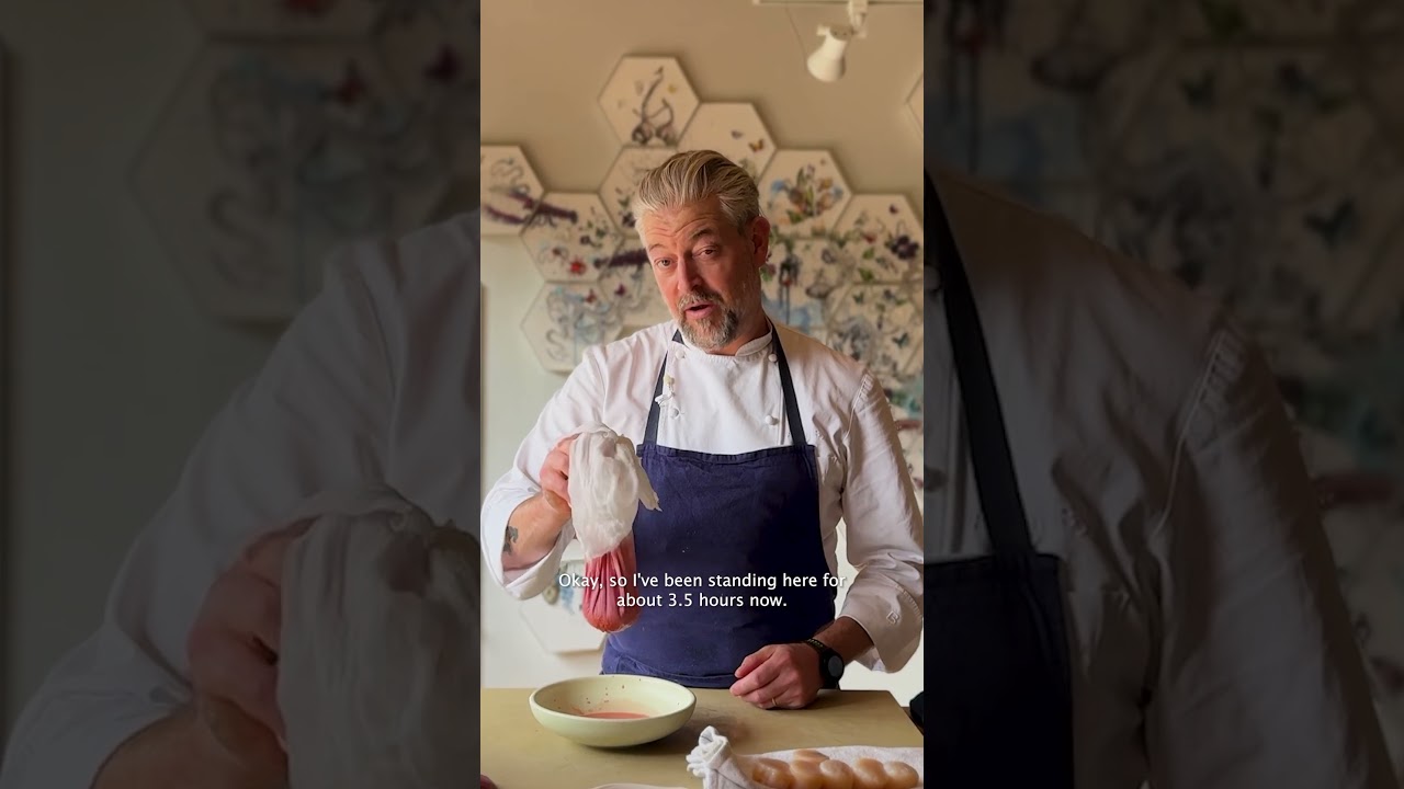 So here's a dish which is on the menu at Trinity at the moment. This is fresh scolops using the very best of what's available at the moment. We're going to start with these handdyed scolops which we get in. Cut through that muscle. Take the bottom shell off and then we use a spoon underneath that muscle there. Once the scolop is freed up, put your thumb along that muscle. Push in, push down, and pop out the meat like so. First thing we're going to do is just prep some of these tomato. These are vuvius tomatoes. They go flat on a plate like that just so they can be seasoned really nicely. We give that a little of black pepper as well. Cut through this peach. Slice those very thin as well. So once you've sliced all those peaches and all the tomatoes, you're left with a trim and that's going to form what is the base of the dressing for this dish. Give that a blend. There we go. I'm going to do is hang that on a bit of muslin. You can put it through a shimar or a fine sie if you wanted and then just hang it through like that. Okay. Okay. So, I've been standing here for about 3 and 1/2 hours now. What we're going to add into that is this is a pickle liquor. Put a little bit of that in there. And the acid in there is what's going to ultimately cook all the scolops as well. And we're going to take this olive oil. It's just extraordinary, isn't it? I just think it's this dressing that brings the whole thing to life. Look, that scolop has been in the shell under 10 minutes ago. And it's that juice on the bottom, the crunch of the tomatoes, the freshness of the whole thing.