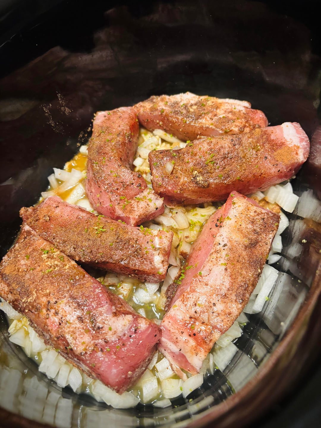 Set it in the slow cooker on one small diced yellow onion and two cloves of minced garlic