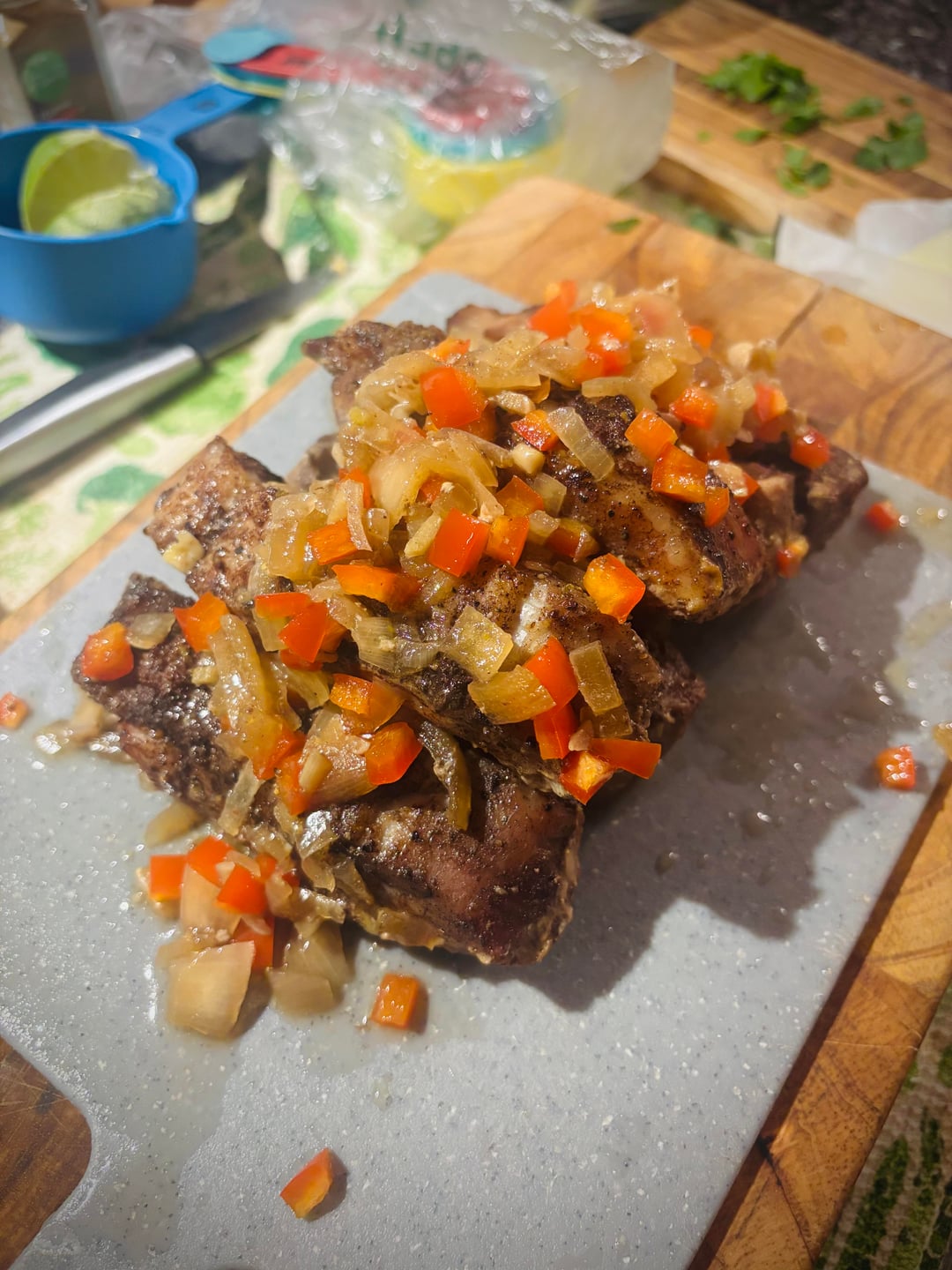 Rubbed the ribs in 1 tbsp salt, 1 tsp black pepper, 1 tbsp brown sugar, 1 tsp allspice, 1 tsp cinnamon, 1/2 tsp cayenne, threw in some chili flakes, 1 tsp powdered ginger (didn’t have fresh in the house)