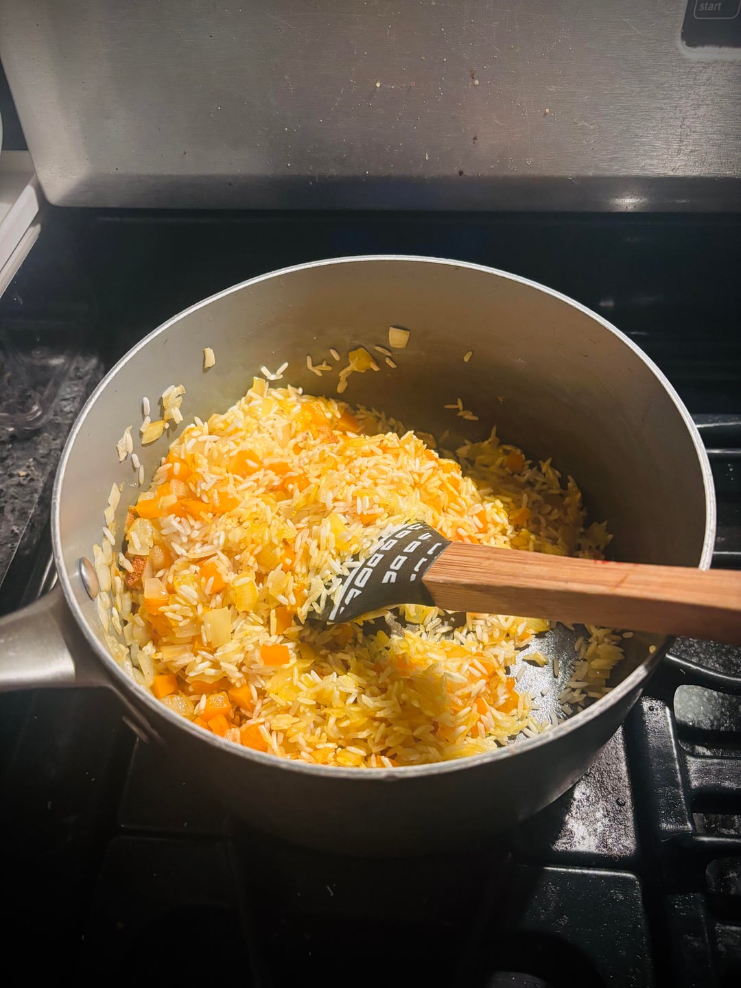For the yellow rice I sautéed another diced onion and an orange bell pepper and one more clove of minced garlic in butter, then toasted a cup of rice in it and added 2 cups of chicken broth to cook it. I folded in some parsley