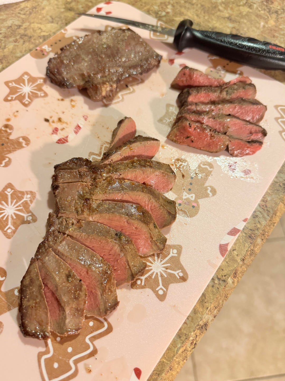 Quick sear in sunflower oil/ EEVO. Seasoned with granulated garlic, granulated onion, thyme, dry mustard, salt and pepper. Need something better for a seasoning next time to really compliment the deer flavor. What’s y’all’s go to seasoning for venison?