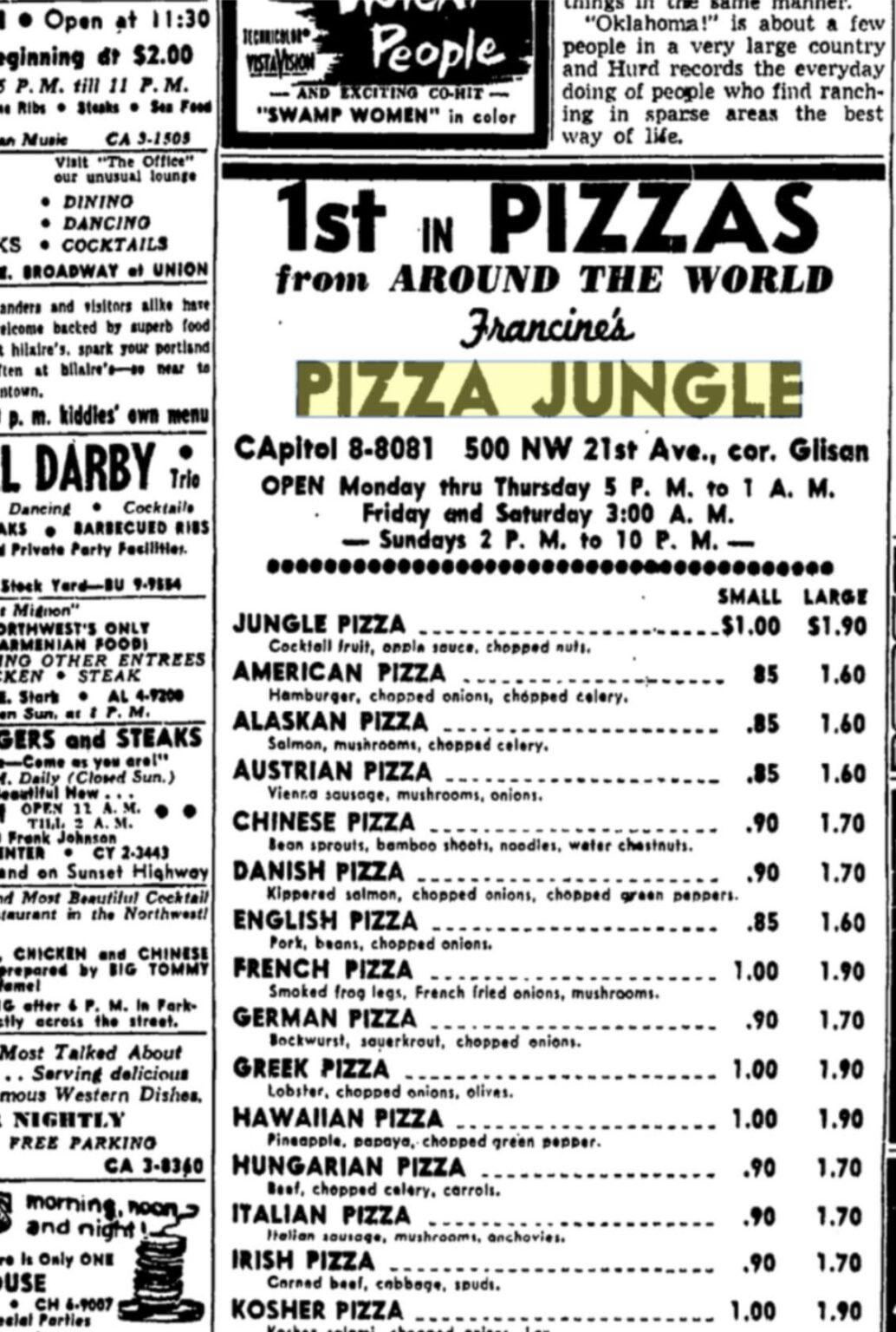 UPDATE: [There’s more menu,](https://www.wweek.com/restaurants/2020/09/13/what-the-hell-was-going-on-with-this-portland-pizzeria-from-the-1950s/) an interesting history of the place, and it possibly served “Hawaiian” pizza 5 years before it was “official”