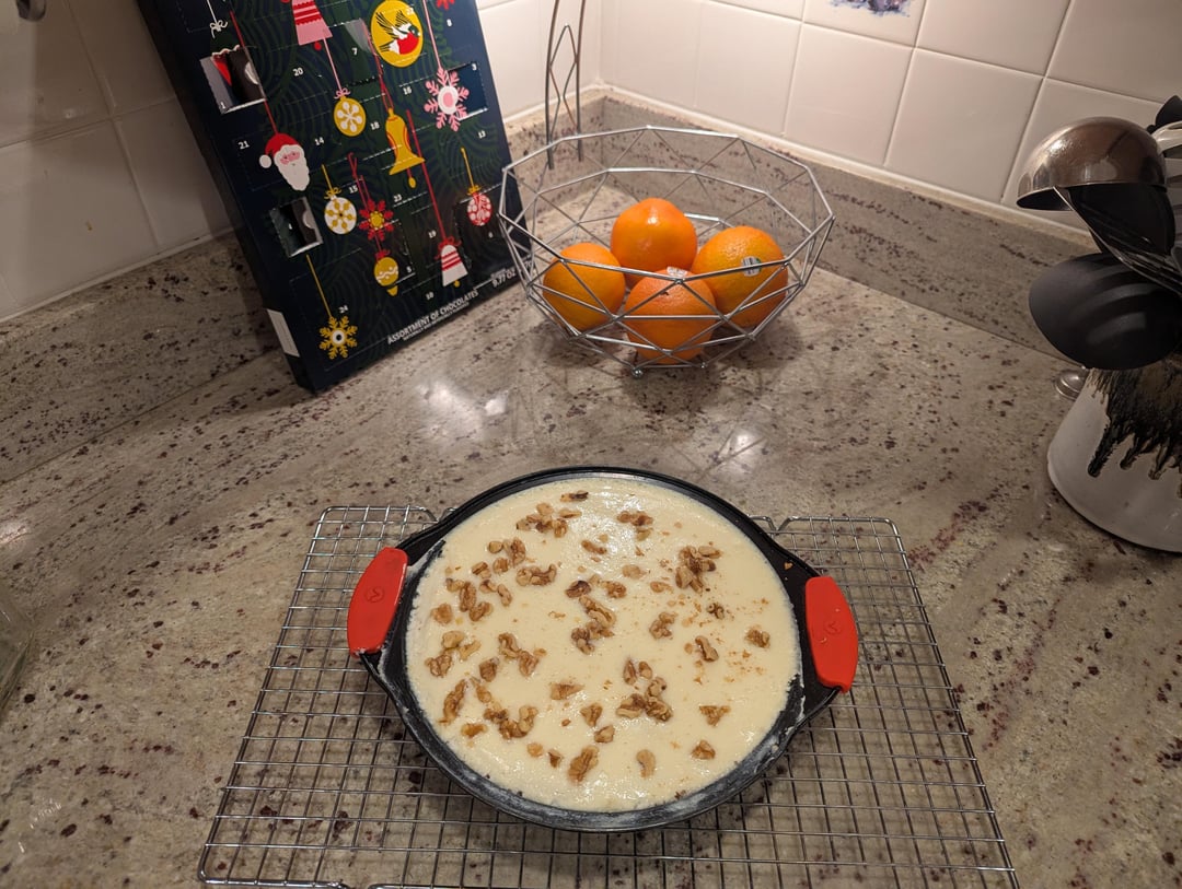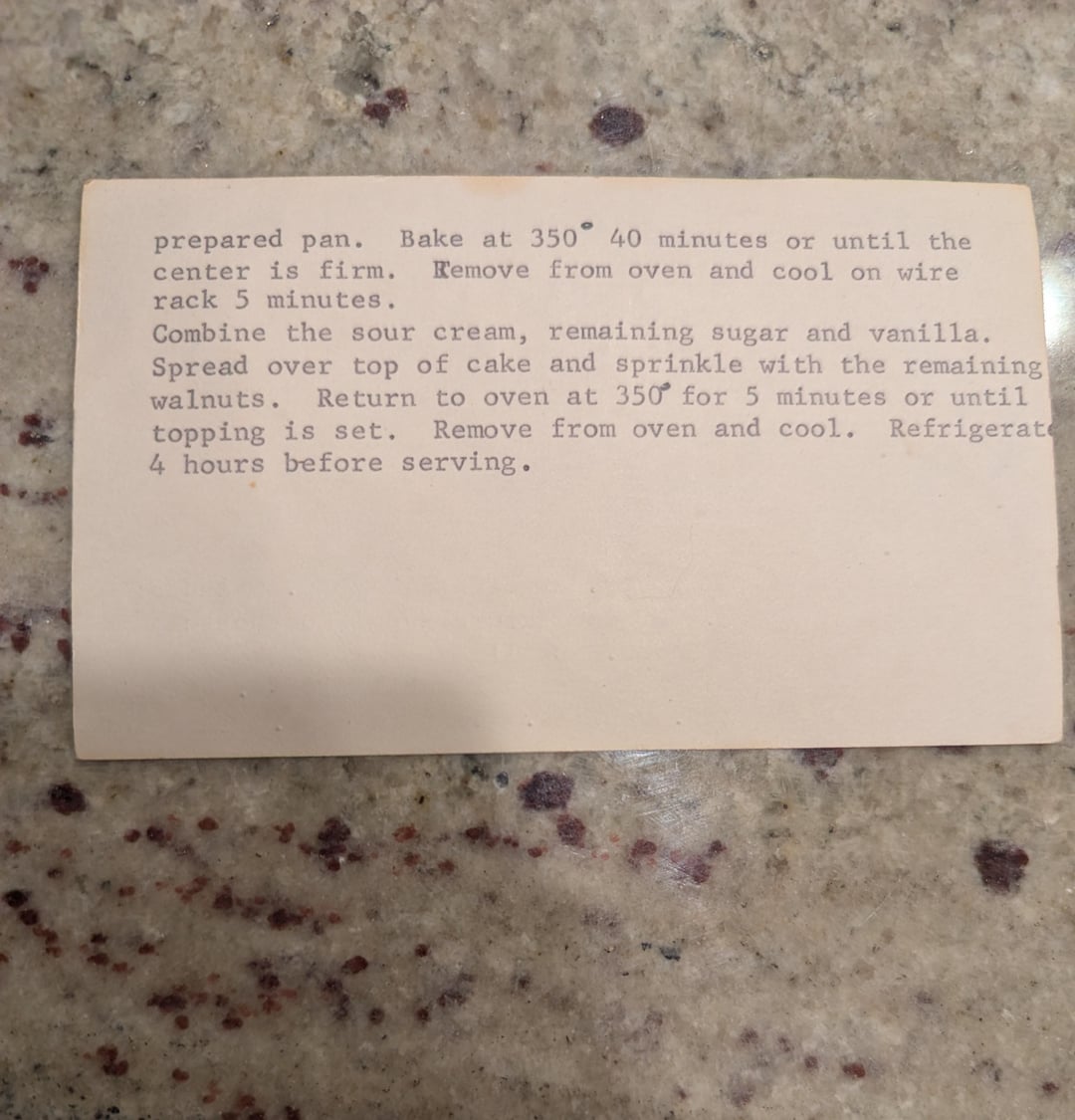 Spread sour cream over top of cake and sprinkle with the remaining walnuts. Return to oven at 350 for 5 minutes or until topping is set. Remove from oven and cool. Refrigerate 4 hours before serving.