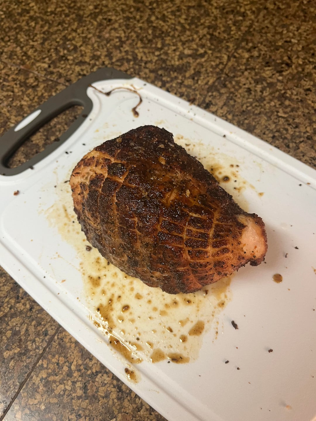 Lesson learned? Probably remove the netting that came around it in the packaging, disrupted the bark too much taking it off after it cooked.