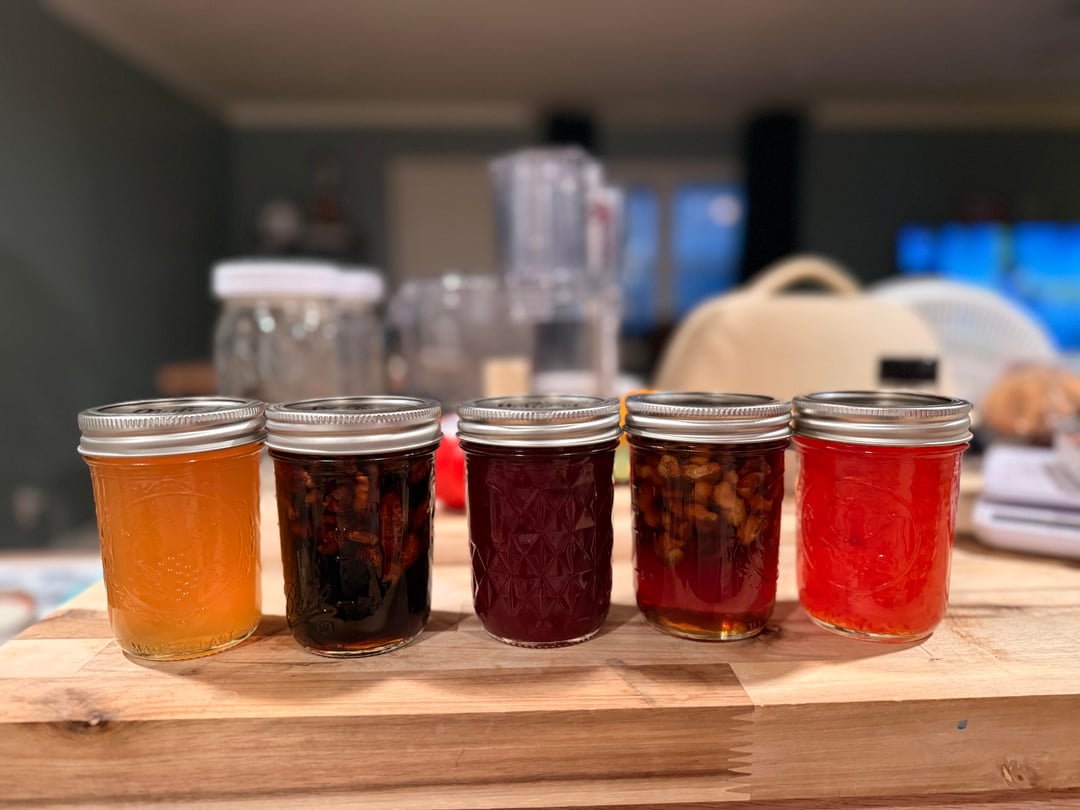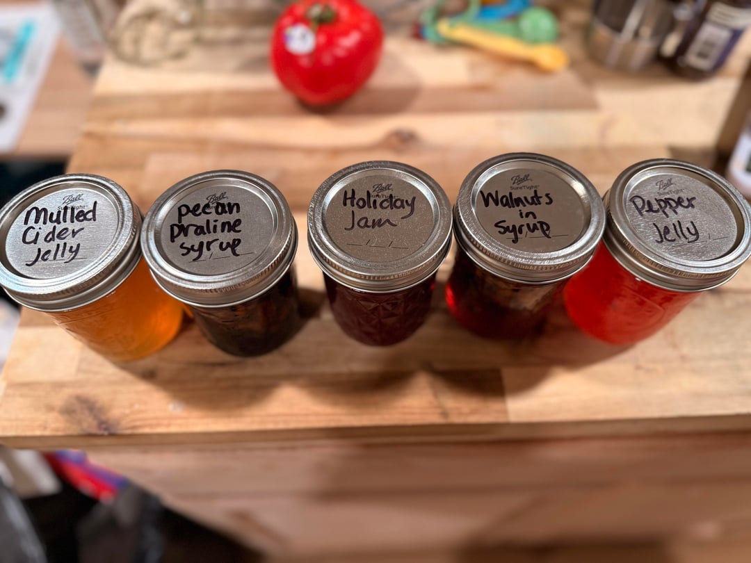 Left to right: Mulled Cider Jelly, Pecan Praline Syrup, Holiday Jam, Maple Walnut Syrup, and Red Pepper Jelly