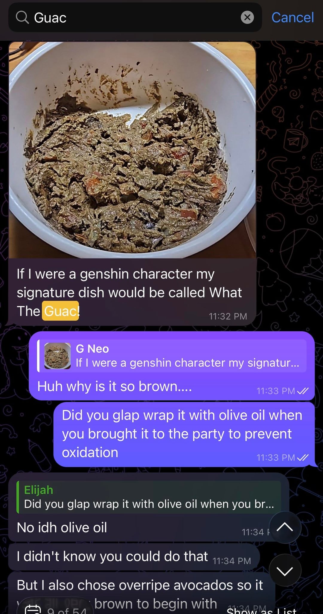 2/3: “What The Guac”: oxidised guacamole made from overiped avocados (also he did NOT serve it at the party, he knew it looked too bad so he just ate it himself)