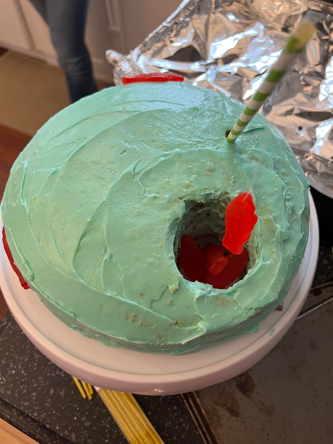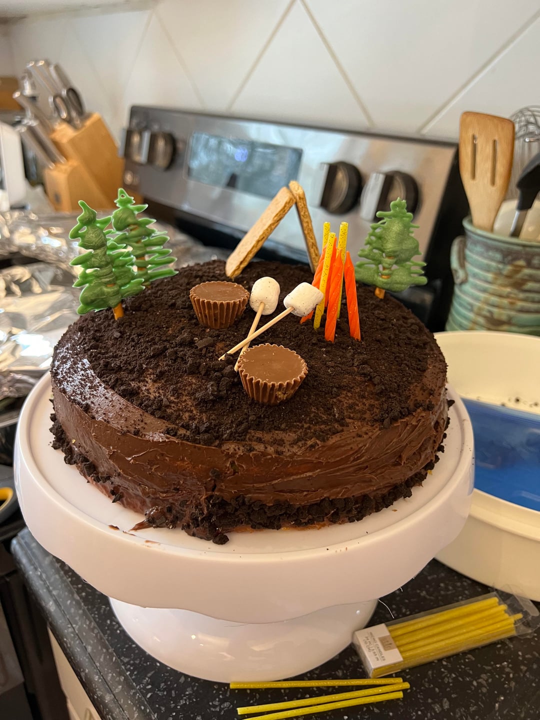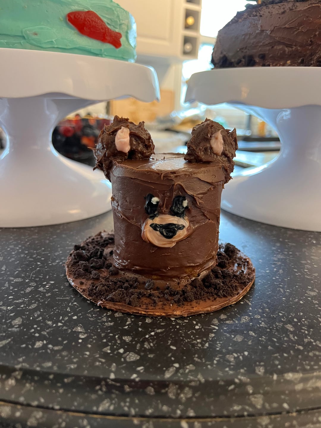 Forgot to cut off the rounded top part on both big cakes, but thought they were cute for a “Camp” these first birthday! First birthday baby bear cake was a “healthy” (low sugar) banana can cake. Fishing cake is a yellow cake, and camping cake is a chocolate cake.