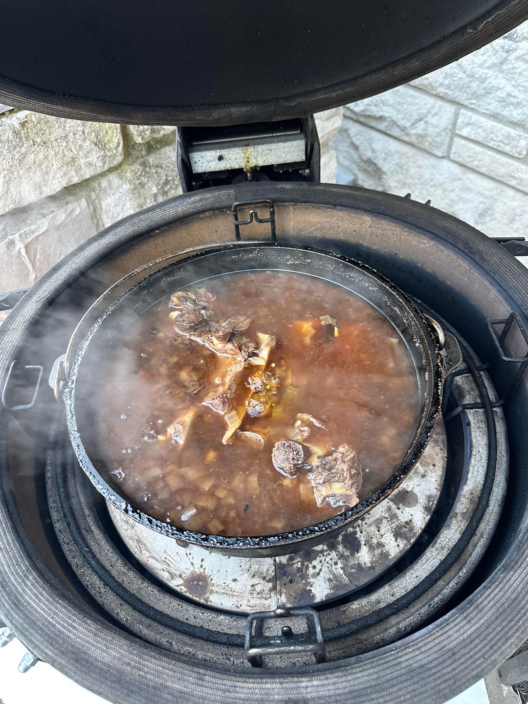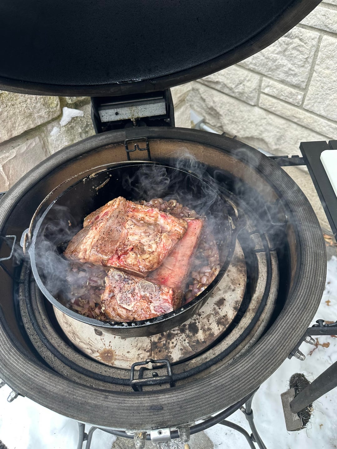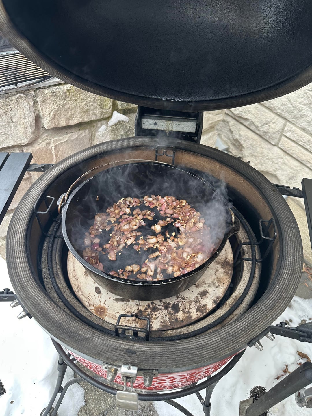 This is one of my labors of love that I do every year, usually a couple of batches. I follow this recipe https://sharedappetite.com/recipes/fire-roasted-chili-with-beer-braised-short-ribs-2/ but I do the braising on the KJ or BGE, I have one of each. Each batch takes around 7 hours give or take but it is worth the effort. Best chili I’ve ever tasted.