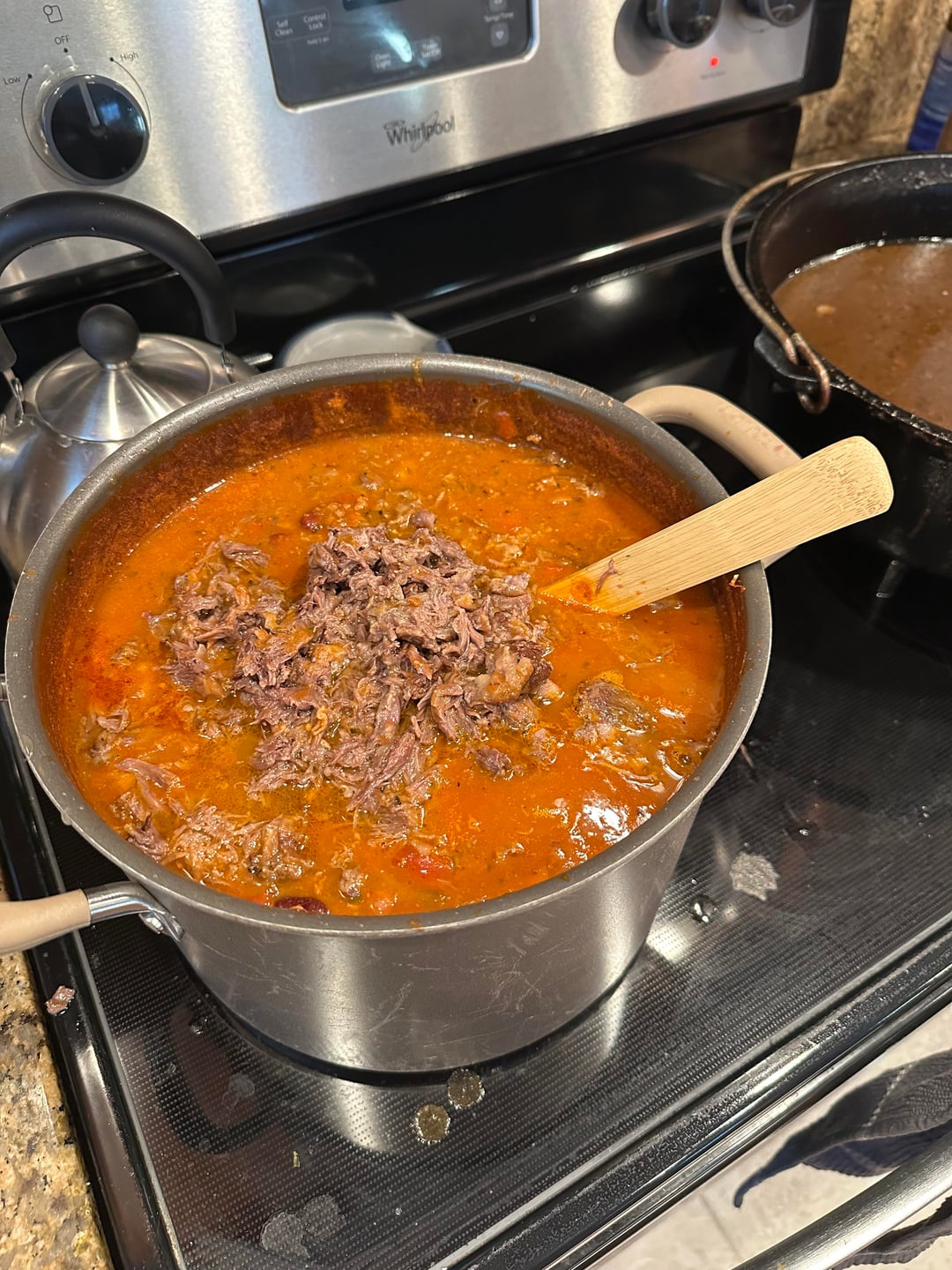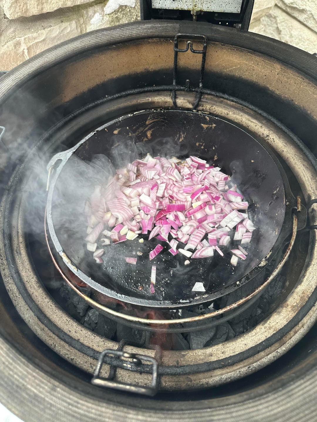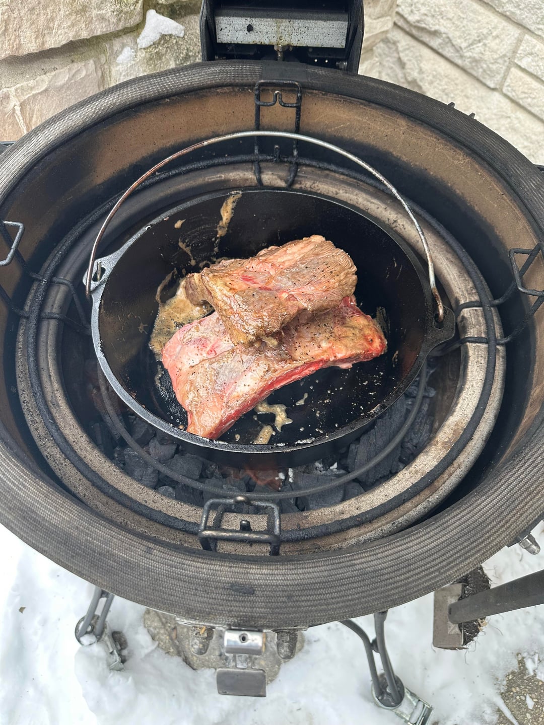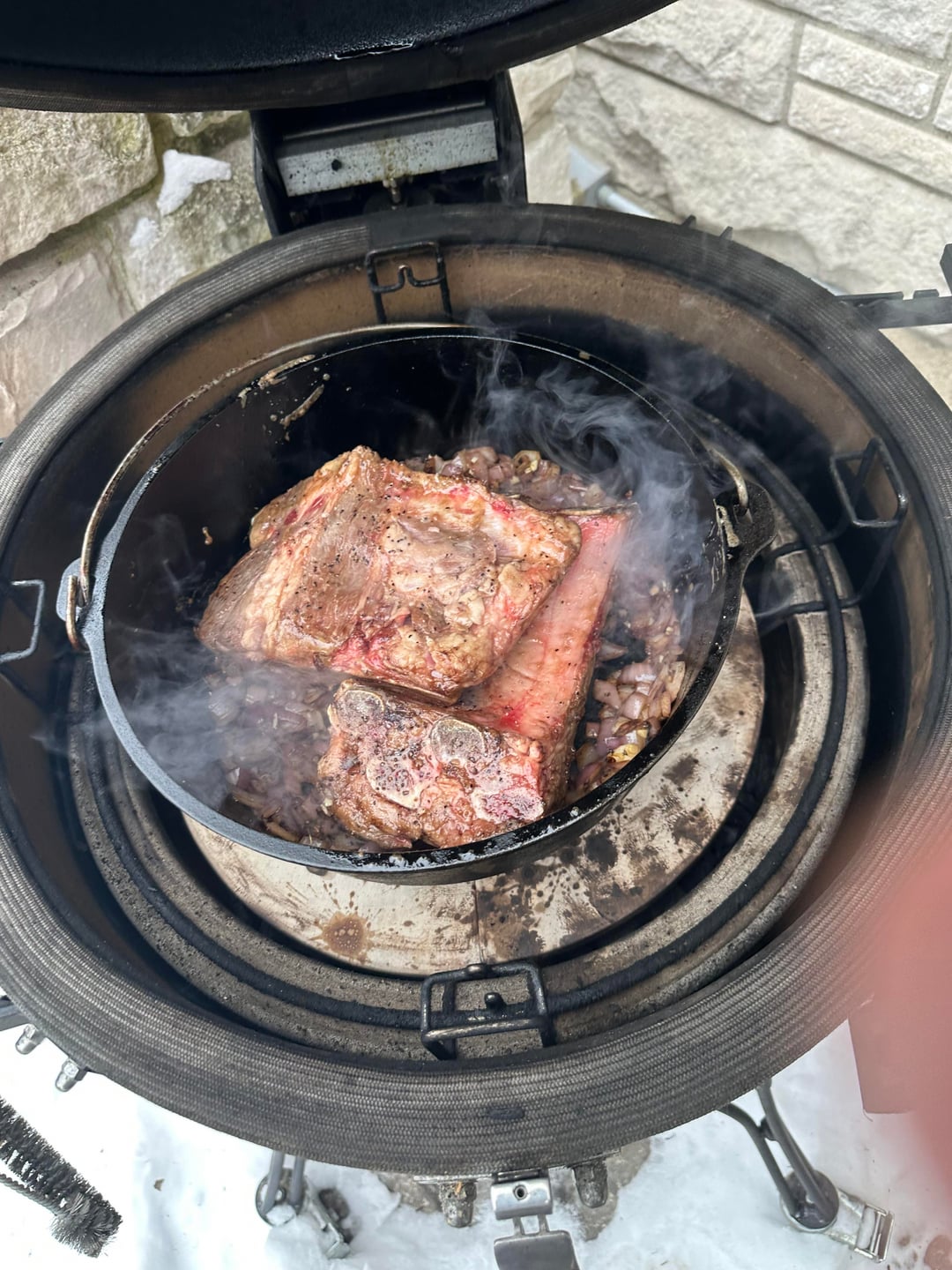 This is one of my labors of love that I do every year, usually a couple of batches. I follow this recipe https://sharedappetite.com/recipes/fire-roasted-chili-with-beer-braised-short-ribs-2/ but I do the braising on the KJ or BGE, I have one of each. Each batch takes around 7 hours give or take but it is worth the effort. Best chili I’ve ever tasted.