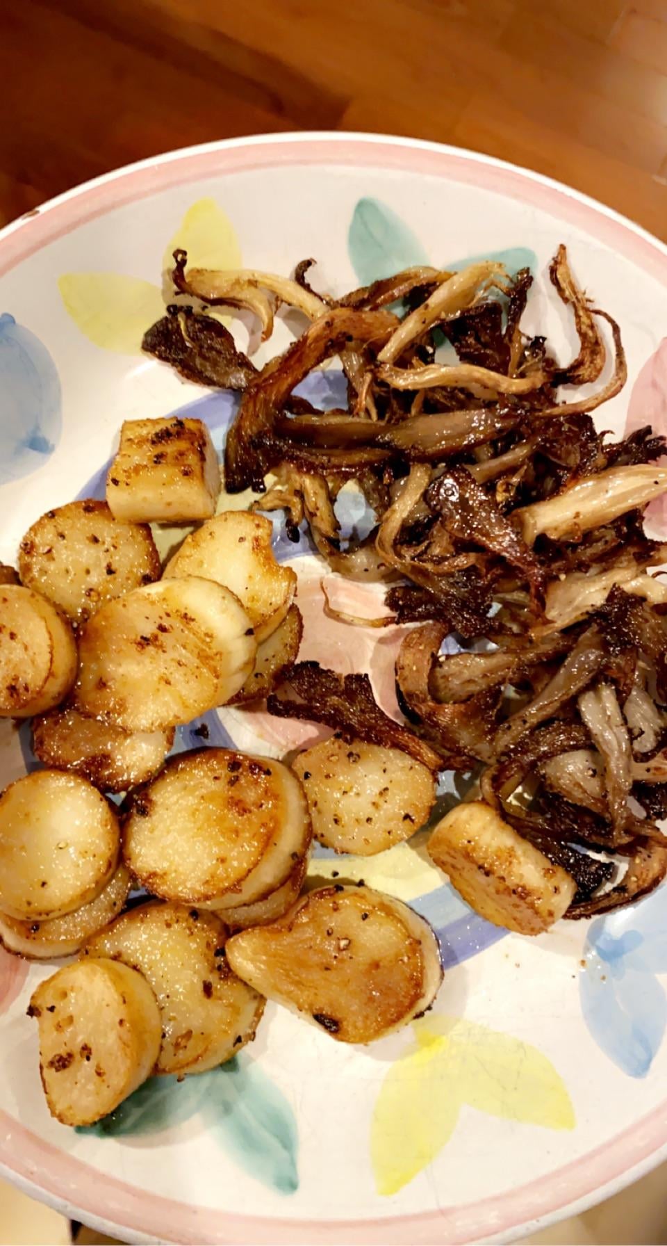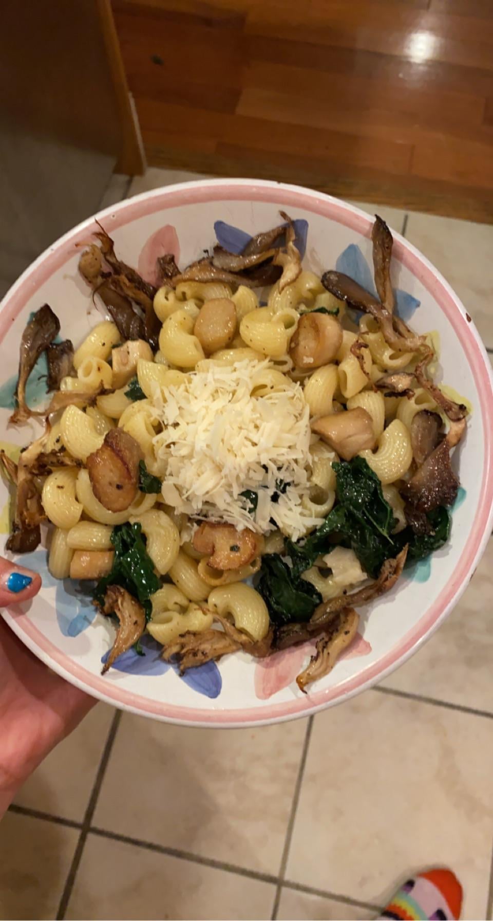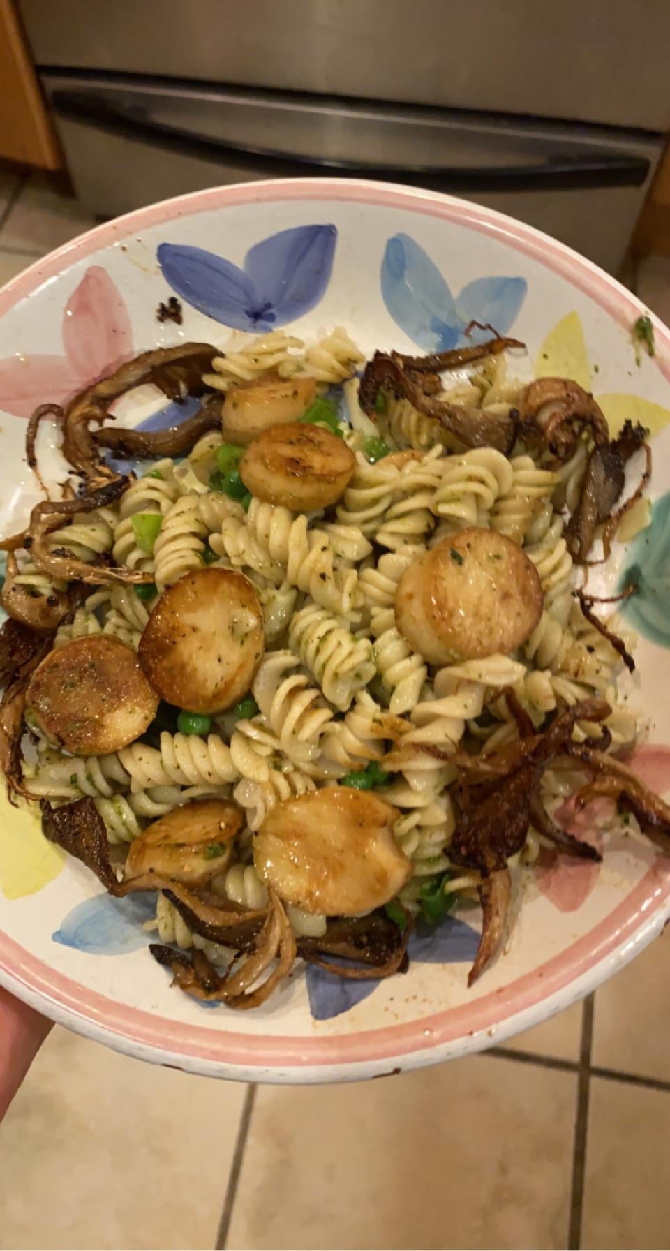 This is my favorite dish. Plant Based scampi with king oyster mushroom stems seasoned like scallops and dairy free parm. two versions of this, and then a close up of the mushrooms. also crispy oyster mushrooms on side