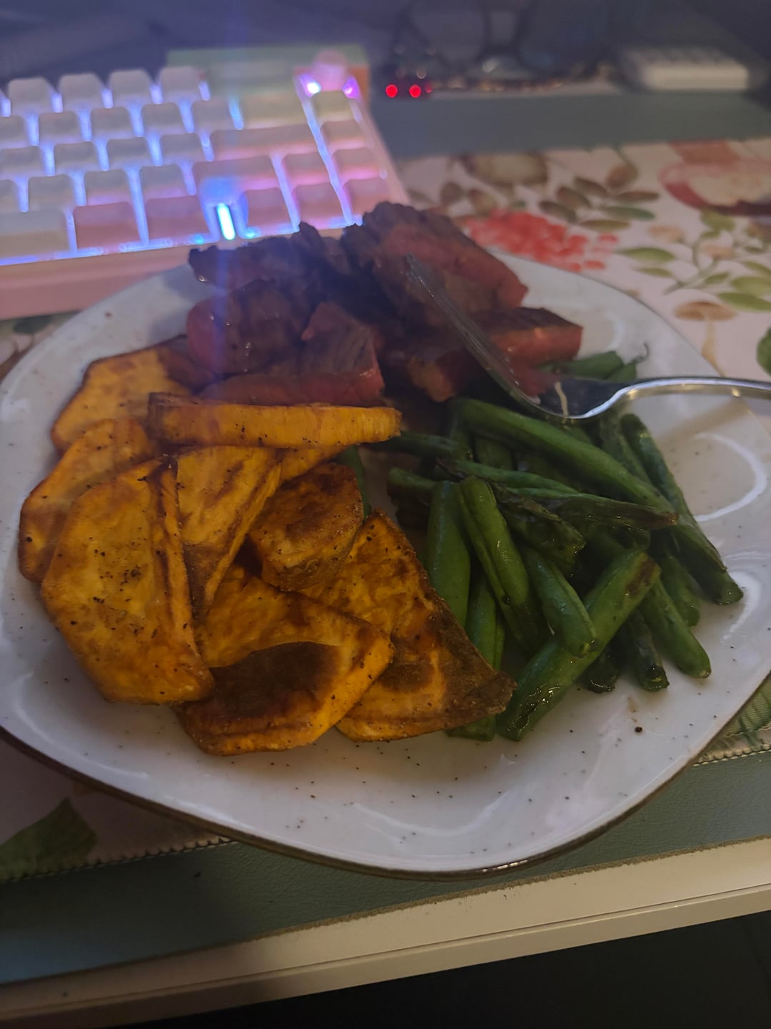 Strip steak, air fried sweet potato, green beans: 276cal, 27g protein.