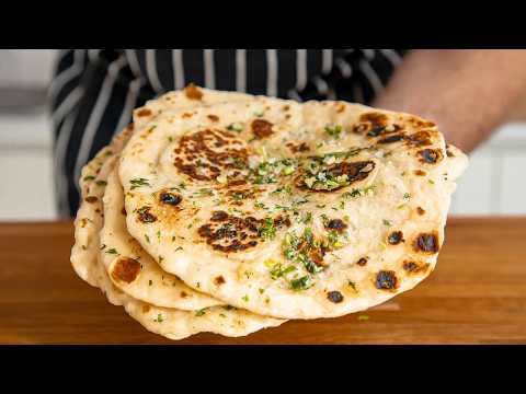 Now to make the best naan bread at home, start by adding 300g or 2.5 cups of all purpose flour into a bowl of some description. Followed by 6g or 1 tsp of salt. And 9g or 2.5 tsp of sugar. Give it a whisking to combine. In a separate jug mix 125g or 1,5 cup of slightly warm blood temperature water with 3g or 1t spoon of instant fast action yeast. If you are using fresh yeast, double the amount. Yeast is important for the proper light and chewy texture we all love about great naan. Stir in 100g or 1,5 cup of plain Greek yogurt and 200g or 1,5 tablespoons of melted ghee or cooking oil. Mix together and let it stand like a naughty boy in the corner to bloom for 10 minutes. Once kind of frothy, add it to the flour and mix it into a rough dough. At this point it won’t be smooth, but the liquid should all be in there with no dry bits of flour lift. Cover with a damp towel for 15 minutes to fully hydrate the flour. Once hydrated, very slightly dust your workbench. Dump the dough onto it and gently, but not too gently, knead and fold into a round, smooth dough ball. Pop it back into the bowl and cover with your faithful old damp tea towel. Place it into the oven with only the light turned on. Or simply a warmish place so it can rise and double in size. Which should take about 1.5 to 2 hours. During this time we make a garlic butter. Which is half the secret to these wonderfully addictive Indian flatbreads. Heat the pan on medium and add 50g or 3tbsp of ghee or butter to it. Once melted, add as many cloves of garlic as your breath desire. I used about 6, which just about keeps me from being homeless. Lightly cook it on low heat without caramelizing it. Once done, you set it aside and keep it at room temperature. Once your naan dough has risen beautifully, you knock it back and lightly flour your bench. Divide the dough into 8 roughly equal pieces, weighing about 70 to 80 grams each. If you want to be specific, then weigh it, but for home use, with adequate people, the one or two grams left or right won’t usually cause domestic disputes. But then again, avoiding problems are easier than dealing with them, so you decide what works best for you and your reality. Once divided, you grab a tray of some description and lightly oil it with cooking oil. Tightly shape each piece of dough into a taut round ball. We’ll slow it down so you can get the technique right. I flipped the dough onto its smooth side. Then bring the edges onto itself in gentle stretch and fold motion. Once you’ve gone round the outside, round the outside you pinch the bottoms together. Give them a light roll on the table to make sure they are perfectly round. Then pop them onto your oiled tray. I like oiling my hands, as well as the dough balls, to prevent introducing too much flour along the way and it also makes the shaping step much easier. Once they’re all oiled up, shiny and round, cover with another tray, turned upside down, or simply some Greta wrap. Let them proof until 50% increased in size. This takes about 30 minutes. But use your common sense and sight. If you unfortunately don’t have that, then thanks for watching anyway. You know I love you and will make a plan. While that’s doing its thing, you will need a cast iron skillet or a heavy bottomed pan. Traditionally, none is cooked in a tandoor, so we need to mimic the heat to get close to the real deal. Apart from that, we need a little bit of flour for rolling them out and a tiny bit of ghee or oil to brush the pan with. The dough is ready when nice and puffy, but not deflating when you touch it. We do these one by one, so keep the dough covered. Also grab a plate and bowl to keep the cooked ones warm, while we soldier through these. Heat your pan on low gently while we shape these up. Lightly dust your workbench with flour. Many Indian restaurants use a ton of oil in their step, but will keep it home friendly for you. Place the top side onto the table, meaning flip the dough over like a turtle on its back. Gently, but not too gently, work the dough with both hands into a round flat shape. Make sure to flatten the sides too, to avoid ending up with a pizza shape. You can stretch these thin enough after enough practice, but for now, just use a rolling pin to get them nice and thin. They should be almost see-through and close to tearing. If they do tear, just stick them back together or cook it like that. No one cares. And if they do, simply divorce them. By now, our pan is nice and hot and ready for your first naan. Lightly oil the pan. I simply use a drop of oil and then wipe it with a paper towel and then does the job well. Place your dough into the hot pan and watch that thing puff up and blister along. Move it around and check the bottom every few seconds or so to make sure things don’t get too dark. You want to charred, but not so charred, that it’s burnt and unpleasant. Flip the naan around and cook the other side. Once nice, blistery and adequately charred all over, you place it into a bowl you prepared earlier. Brush it with your garlic butter and an optional but highly necessary sprinkling of chopped soap plant, also known as cilantro or coriander. Finish with a sprinkling of fleur de sel or flaky sea salt to be fancy and adequate. Then cover with a plate to keep warm. Repeat the process until all your naans are cooked. Roll it. keep it warm. Ready to have with us ridiculously tasty butter chicken we made last week. But more importantly, ready to go live a happy life.