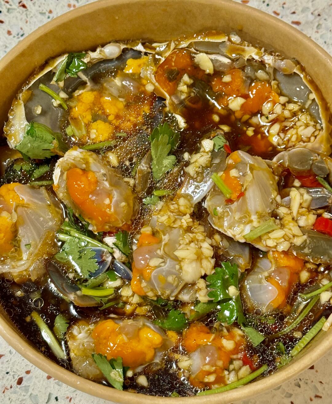 Homemade raw marinated crab with garlic, chili, cilantro, and soy-based sauce
