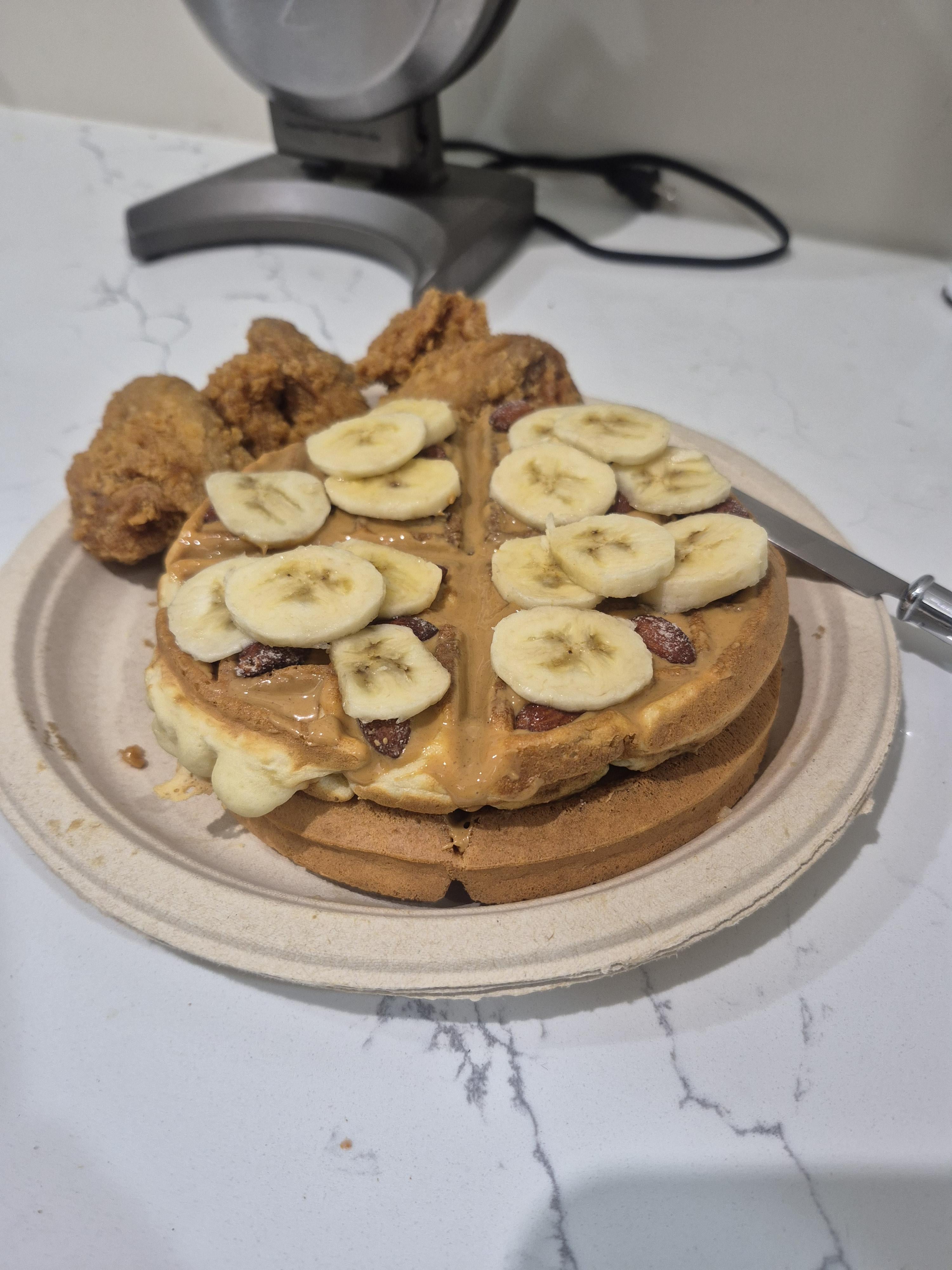 Bananas, peanut butter, and almonds were topped off on the waffles, with a side of chicken wings. Anyone got an appetite?by EZlyLegendary 1 Comment Bubbly57 4 weeks ago This looks absolutely delicious 😋Save me a plate ! 😃