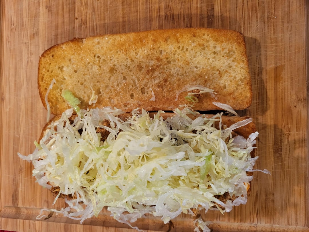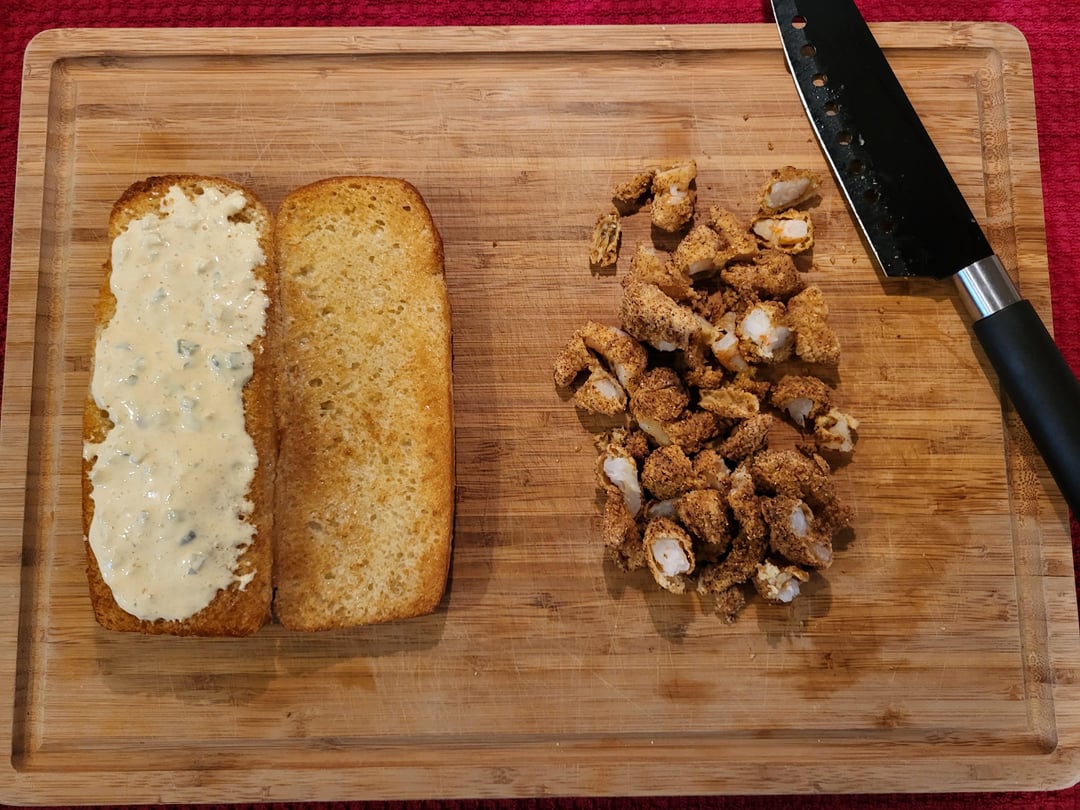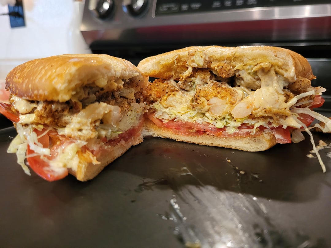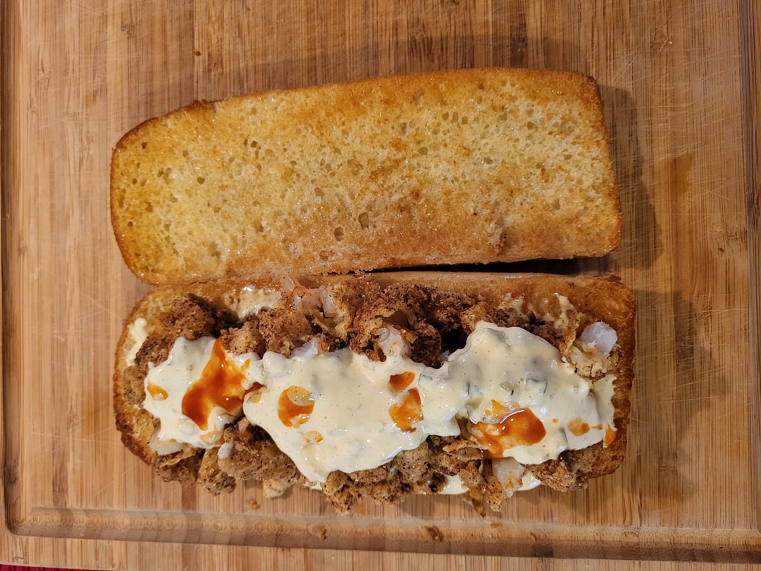 Step 1: Mini French loaf with mayo, toasted golden. Slather it with a cajun dill remoulade (1/2 cup mayo, 2tbsp Dijon, 2tbsp Crystal hot sauce, 2tbsp Vlasic dill relish, 2tsp chopped capers, 2tsp minced garlic, 2tsp lemon juice, 2tsp each salt, cayenne, Weber cajun seasoning). Season the hell out of some shrimp and deep fry them. I like mine chopped for more efficient sandwich packing.